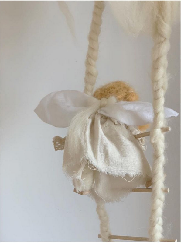 Ich werde noch einen kleinen Engel als Biegepuppe nähen, der die Treppe hinab steigt. Ihr könnt aber auch einfach den Engel aus Märchenwolle filzen und ihn heruntersteigen lassen. Oder Euch etwas ganz anderes überlegen. Schön ist es auch, wenn Ihr oben eine Wolke aus Wolle macht.