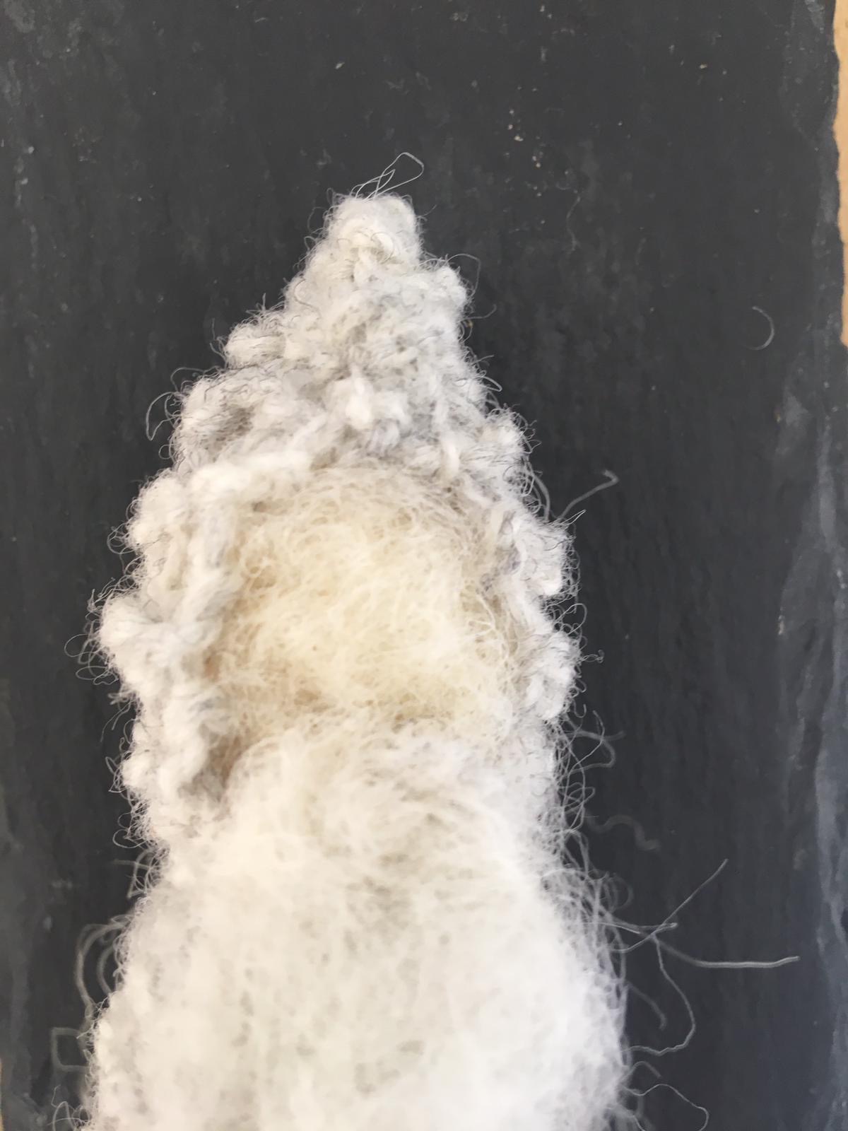 Optimal ist es wenn ihr eine Filznadel habt, dann könnt ihr das Köpfchen und den Stand schön in Form filzen und das Mäntelchen sogar mit der Schafwolle zusammen in Form filzen, es geht aber auch wenn ihr es vorher gut in der Hand formt mit leicht feuchten Händen, versucht es einfach, jedes Zwergel soll ja auch ganz eigen sein!