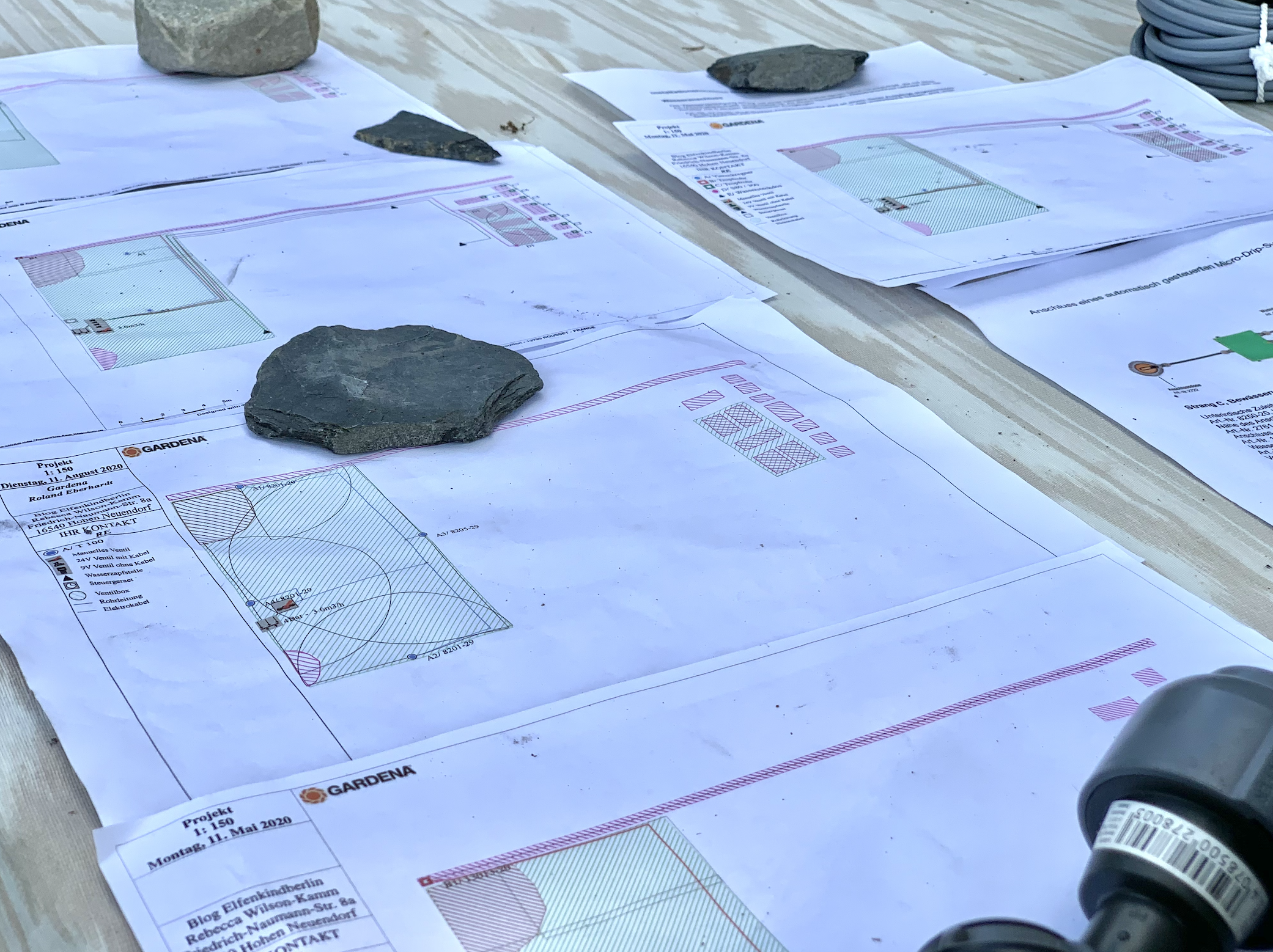 - die gesamten Gardena- Planungen wurden auf unserem Terrassentisch ausgebreitet und schon konnte es losgehen