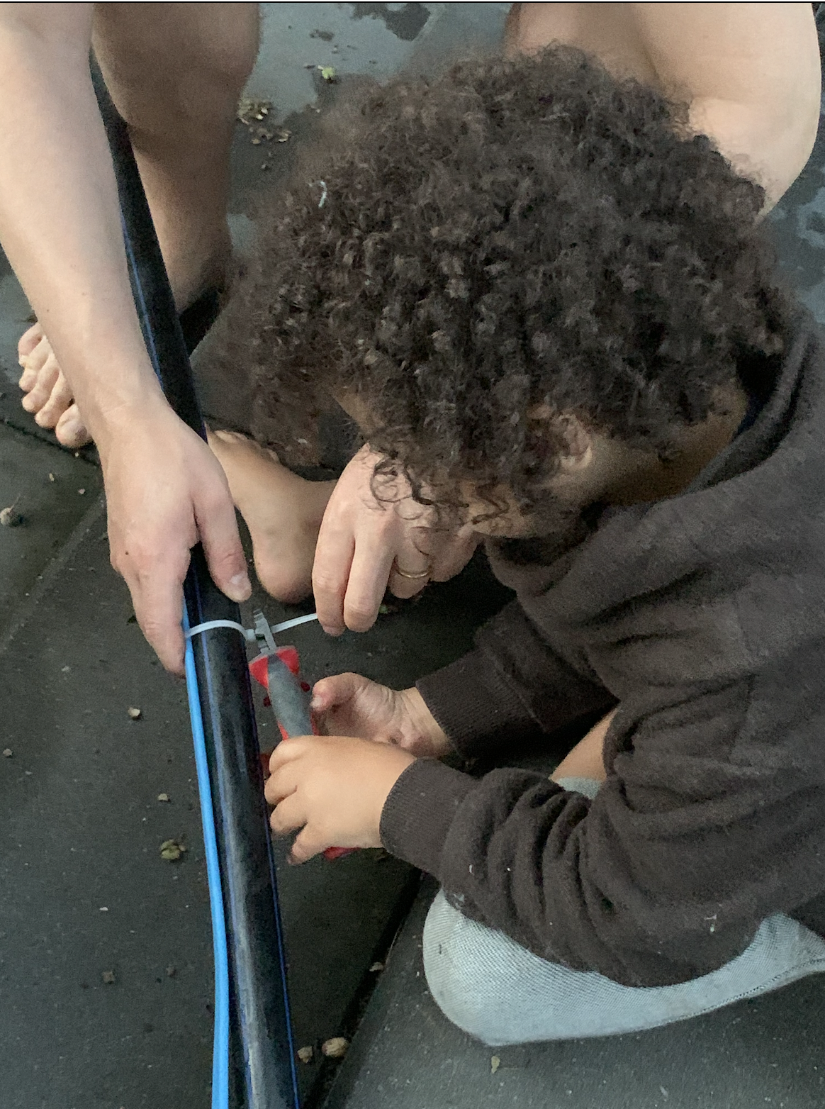 - wenn die Leitungen alle verlegt sind, beginnt die Feinarbeit. Die Tröpfchenschläuche für die Hochbeete und Hecken zurechtschneiden und anschließen.