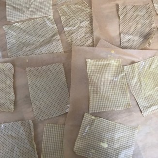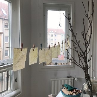 Das Bienenwachs wird im Wasserbad geschmolzen und dann werden einfach die Stoffzuschnitte in das Wachs getaucht. Pro Zuschnitt empfehle ich 2-3 Tauchgänge, dafür wird der Stoff im Bienenwachs gebadet bis er komplett mit Wachs bedeckt ist, heraus gezogen, kurz abtropfen gelassen und wieder eingetaucht. Ich mache das ganze Prozedere immer mit zwei Gabeln. Die Wickel sollten nicht zu dick sein, da sie sonst zu unbequem für die Kinder sind. Als nächstes wird das Wachstuch auf ein Backpapier gelegt. Ich lasse es dort immer kurz antrocknen und hänge es danach noch mal auf eine Leine (ehrlich gesagt nur, da es so schön aussieht und so wunderbar duftet). Wenn sie gut durchgetrocknet sind, bewahre ich sie zusammen mit meinen genähten Stoffwickeln in einem Täschchen im Schlafzimmer auf, damit ich sie immer griffbereit habe.