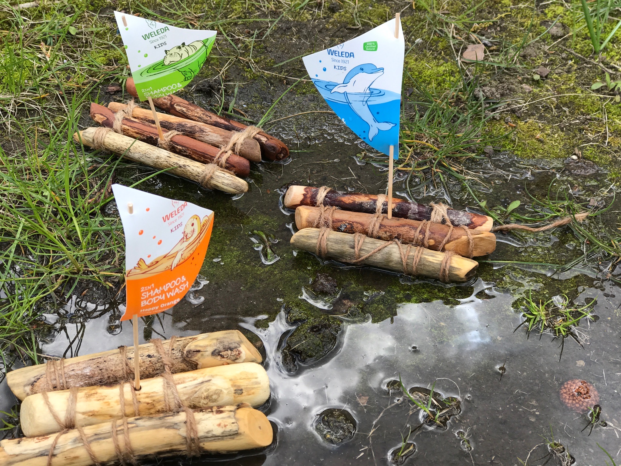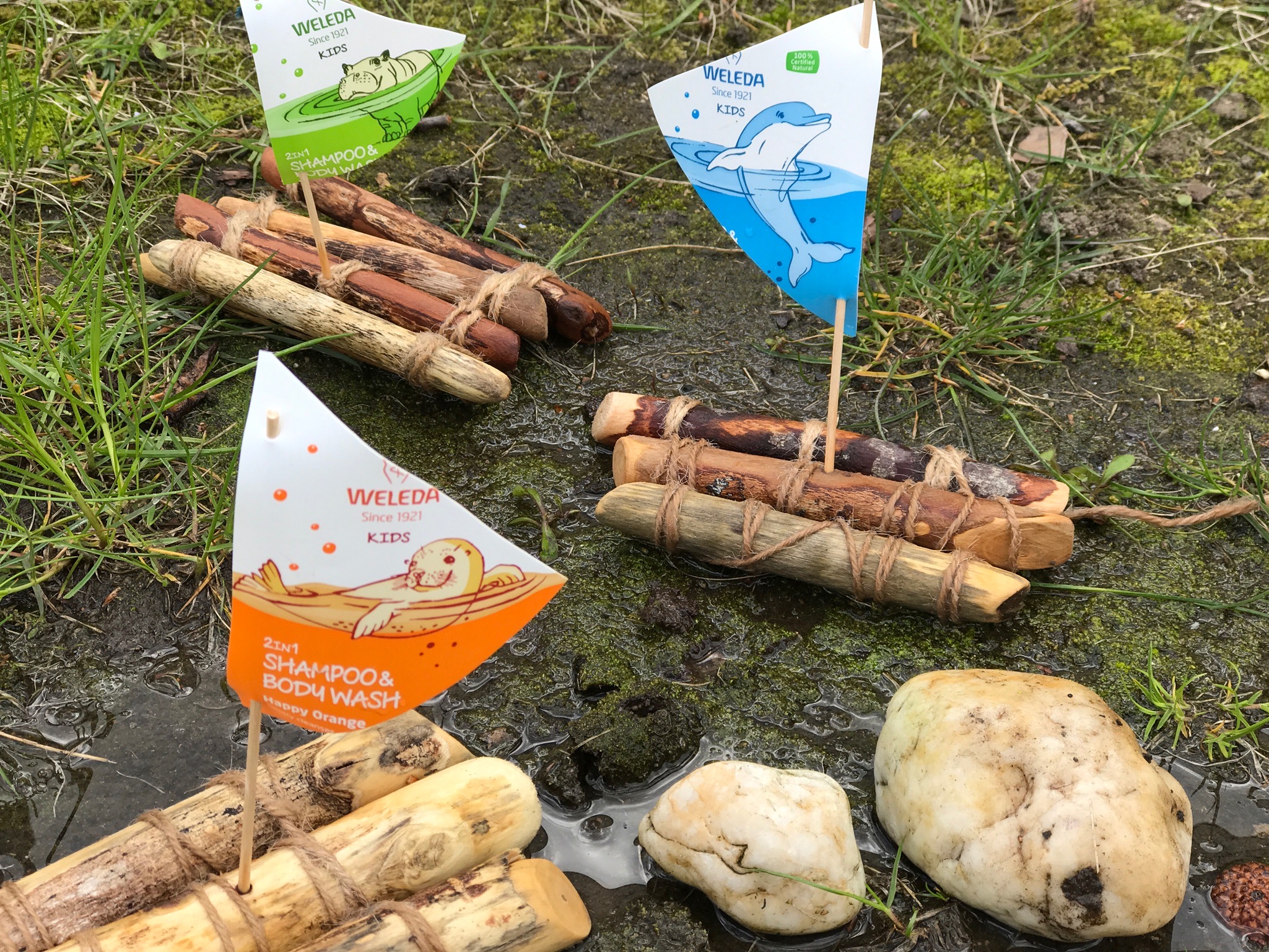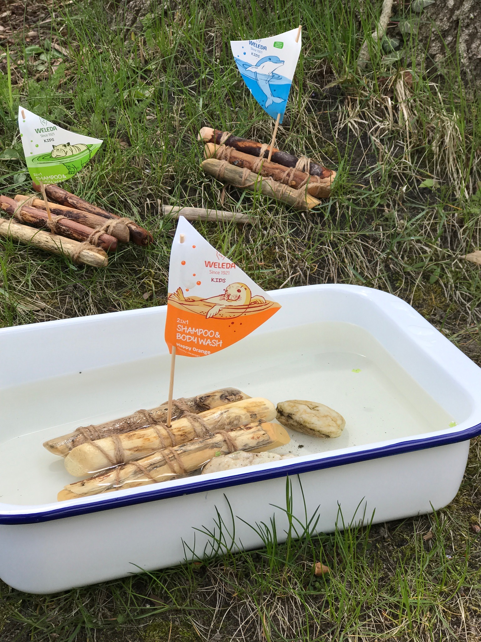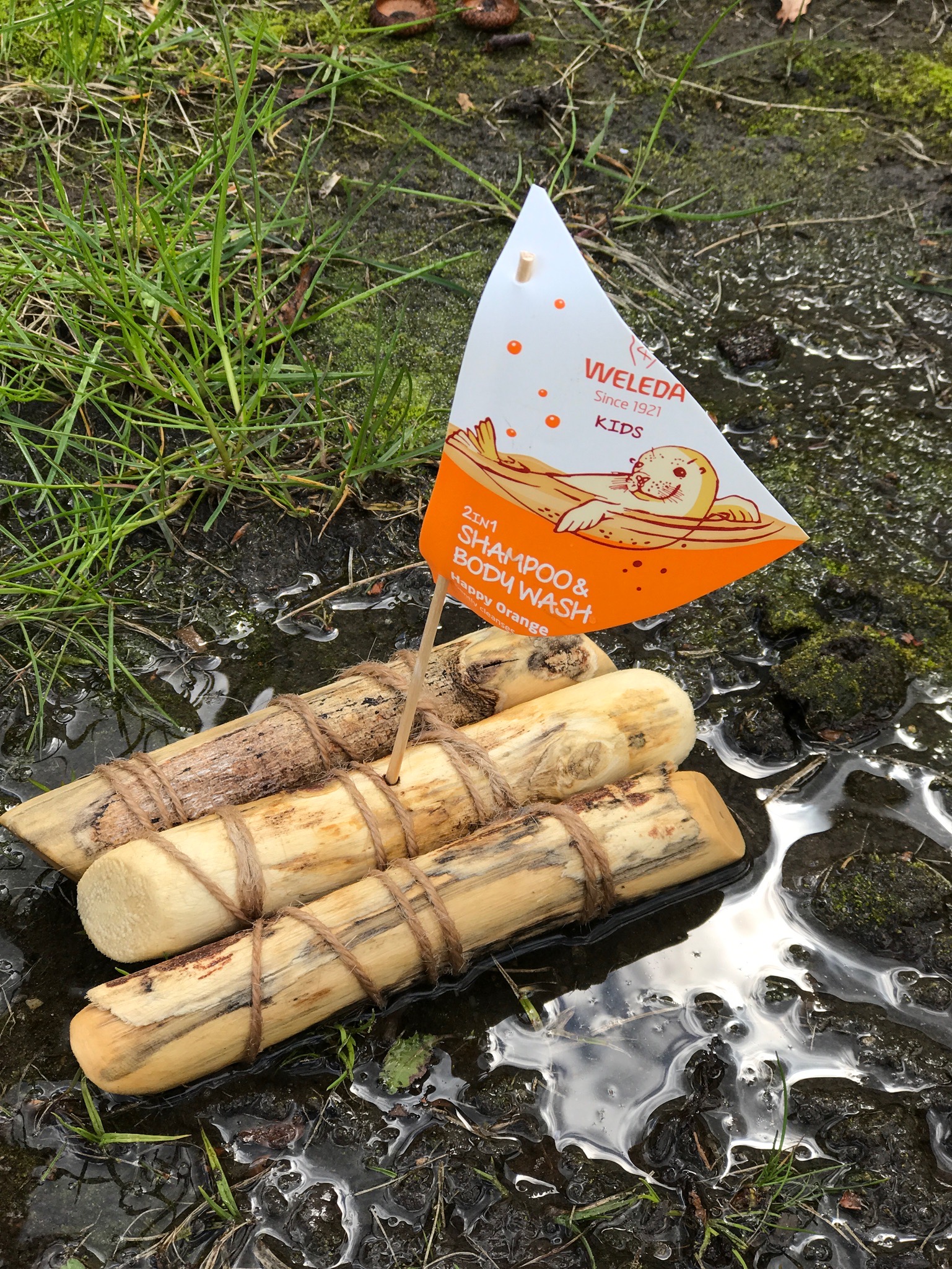 Die hübschen Flaschen vom Weleda 2in1 Shampoo&Bodywash sind eigentlich viel zu schade um sie einfach wegzuschmeißen und von daher haben wir uns eine hübsche und sehr einfach zu bastelnde Boot Idee überlegt. Die Bötchen schwimmen ganz wunderbar in Pfützen, Waschschüsseln und natürlich auch in großen, in der Sandkiste gegrabenen Seen. Bei uns war das Boot sogar schon mit in der Badewanne.