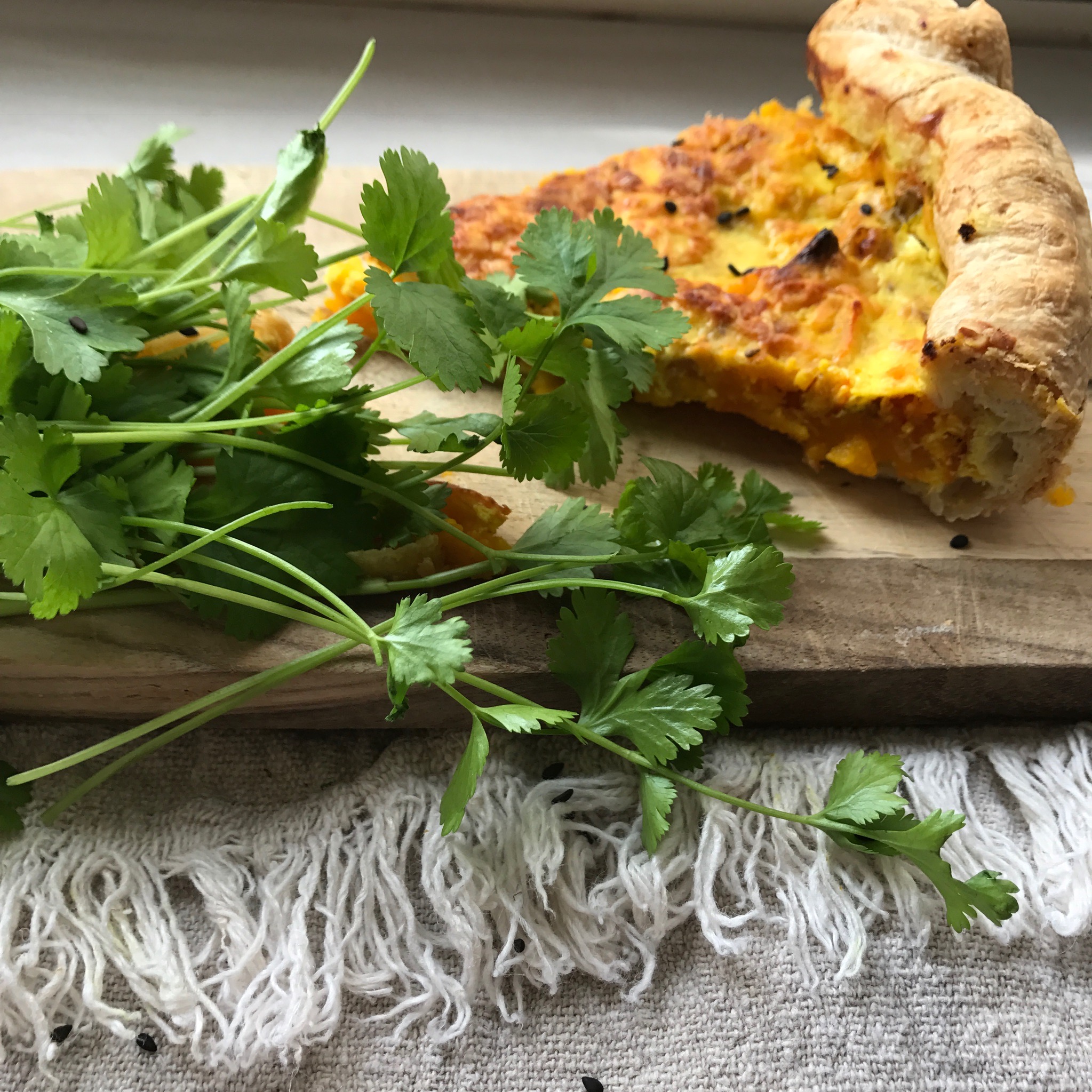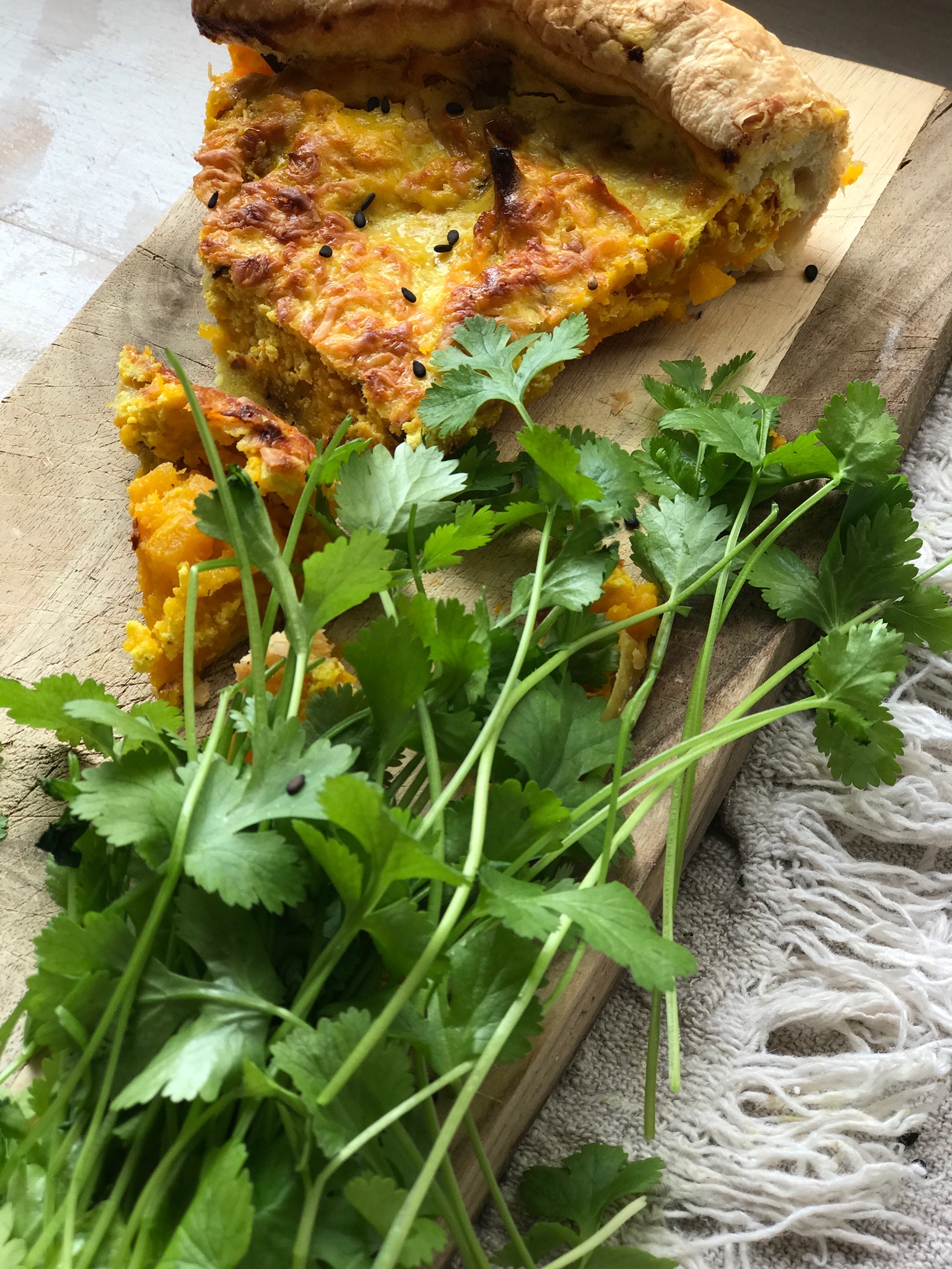 In der Zwischenzeit die Zwiebeln und wenn ihr mögt einen platt gedrückte Knoblauchzehe andünsten und zur Seite stellen. Saure Sahne, Ei und Gewürze mit einem Schneebesen kurz aufschlagen. Den Blätterteig in eine gefettete Form geben, den weichen Kürbis gemeinsam mit dem Zwiebel Gemisch und der Eiermischung auf den Teig geben ein wenig Schafskäse drüber reiben und in die Quiche bei 170° in den Ofen stellen und etwa 30-40 Minuten backen. Fertig! Die fertige Quiche mit frischem Koriander servieren, lecker !