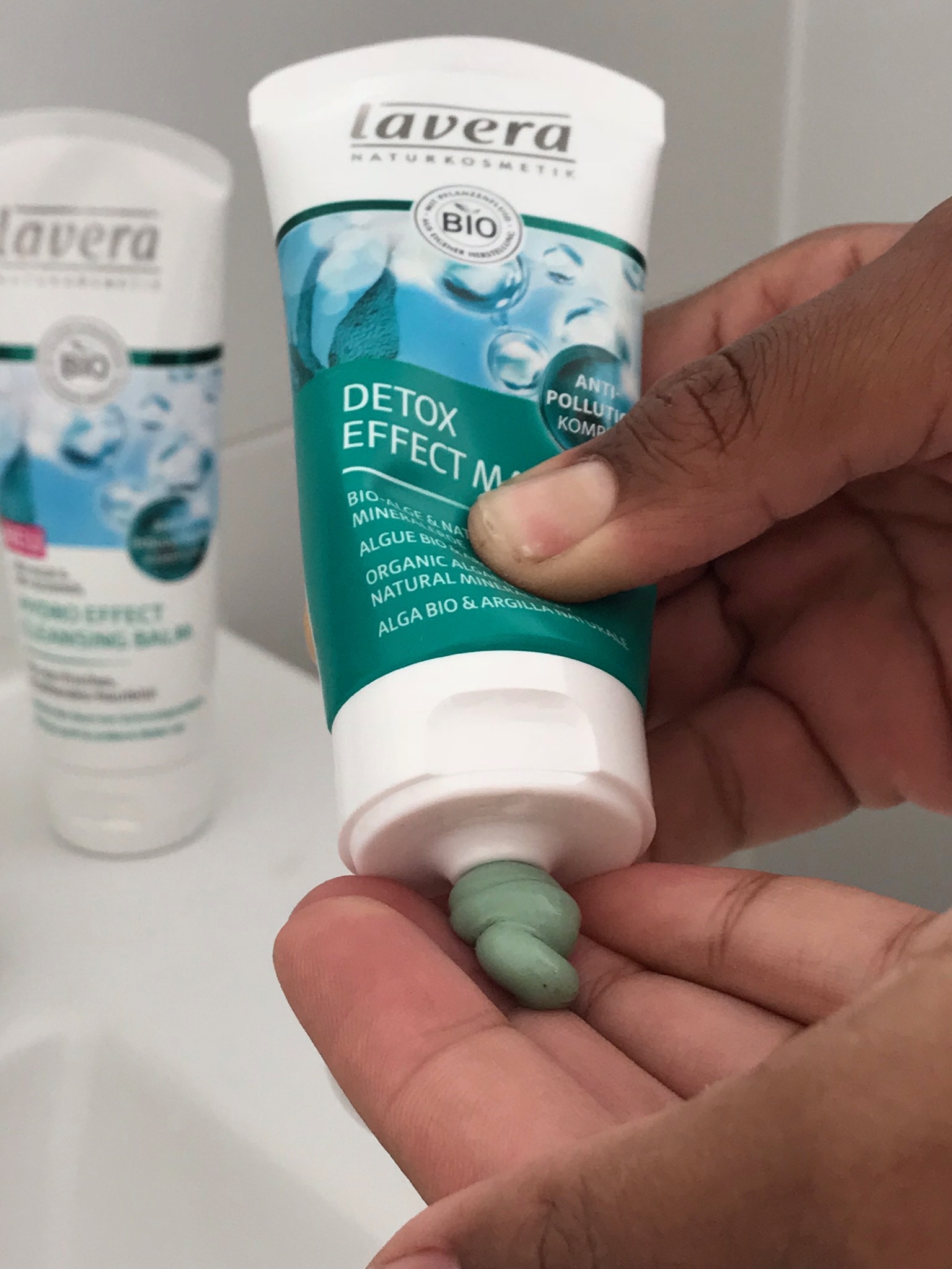 Wenn ich doch mal den einen oder anderen Pickel entdecke, benutze ich die *Detox Effect Mask von lavera zuerst als Peeling/ Waschgel, dann lasse ich sie noch mal separat einwirken und wenn es ein wirklich hartnäckiger Pickel ist, lasse ich sie noch punktuell über Nacht einwirken. Die Maske besteht aus Heilerde, die aus einem Sedimentgestein gewonnen wird. Dieses feine Pulver wirkt entzündungshemmend.