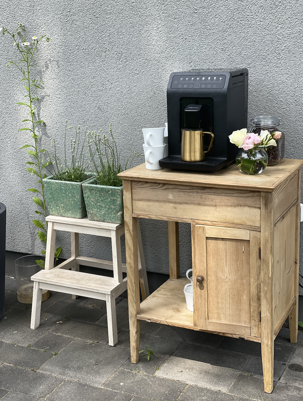 Meine Neue nachhaltige Krups Evidence ECOdesign lässt mich nun ruhiger atmen. Beständig bereitet die Maschine nun einen köstlichen Kaffee nach dem anderen zu, schäumt Milch auf, hat heißes Wasser für Tee bereit und erfüllt einfach jeden Wunsch. An dem Sonntag der Konfirmation, habe ich sie auf einen hübschen Vintage-Holztisch gestellt. Die Bohnen zum Nachfüllen, verschieden Milchsorten im Schrank, Becher, Toppings und Blumen machten unsere Kaffeestation perfekt. Und es klappte hervorragend! Unsere Lieben machten sich selbständig ihren Kaffee, lobten den Vollautomaten für seine gute Arbeit. Kurz: Alle waren glücklich und ich war erleichtert!