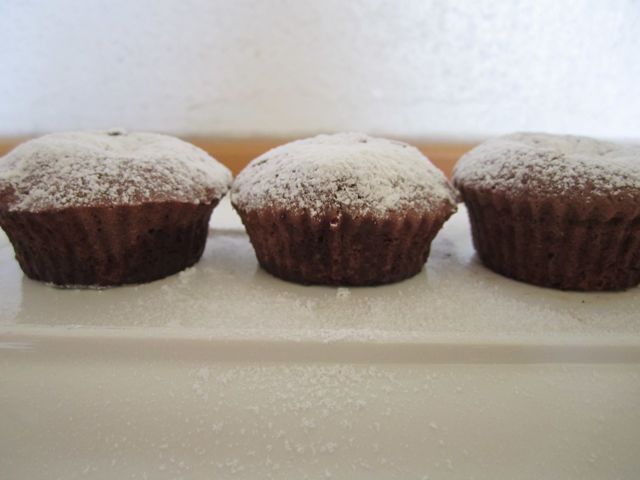Etwas Kakao in die leicht gefettete Silikon Cupcakeförmchen geben und dann den Teig einfüllen , allerdings nicht ganz voll nur etwas mehr als die Hälfte befüllen. Das Ganze bei 160° für 10 min backen (auf gar keinen Fall länger)