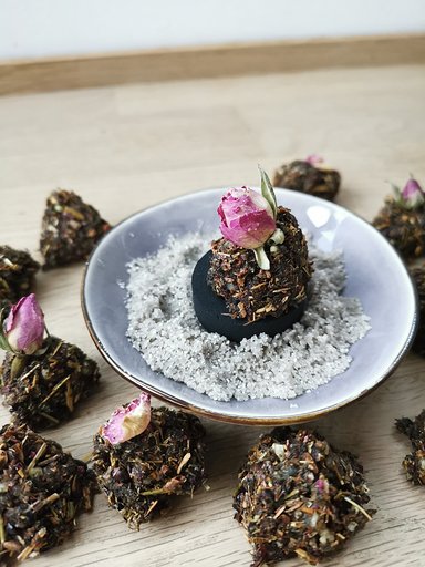 Alles miteinander vermischen und mit dem Mörser anstoßen, 2 große Löffel Wasser hinzufügen, alles vermengen und kleine Kugeln formen. Die Räucherkugeln etwa einen Tag durchtrocknen lassen. Fertig !Ihr könnt die Räuchermischung natürlich auch einfach so räuchern.