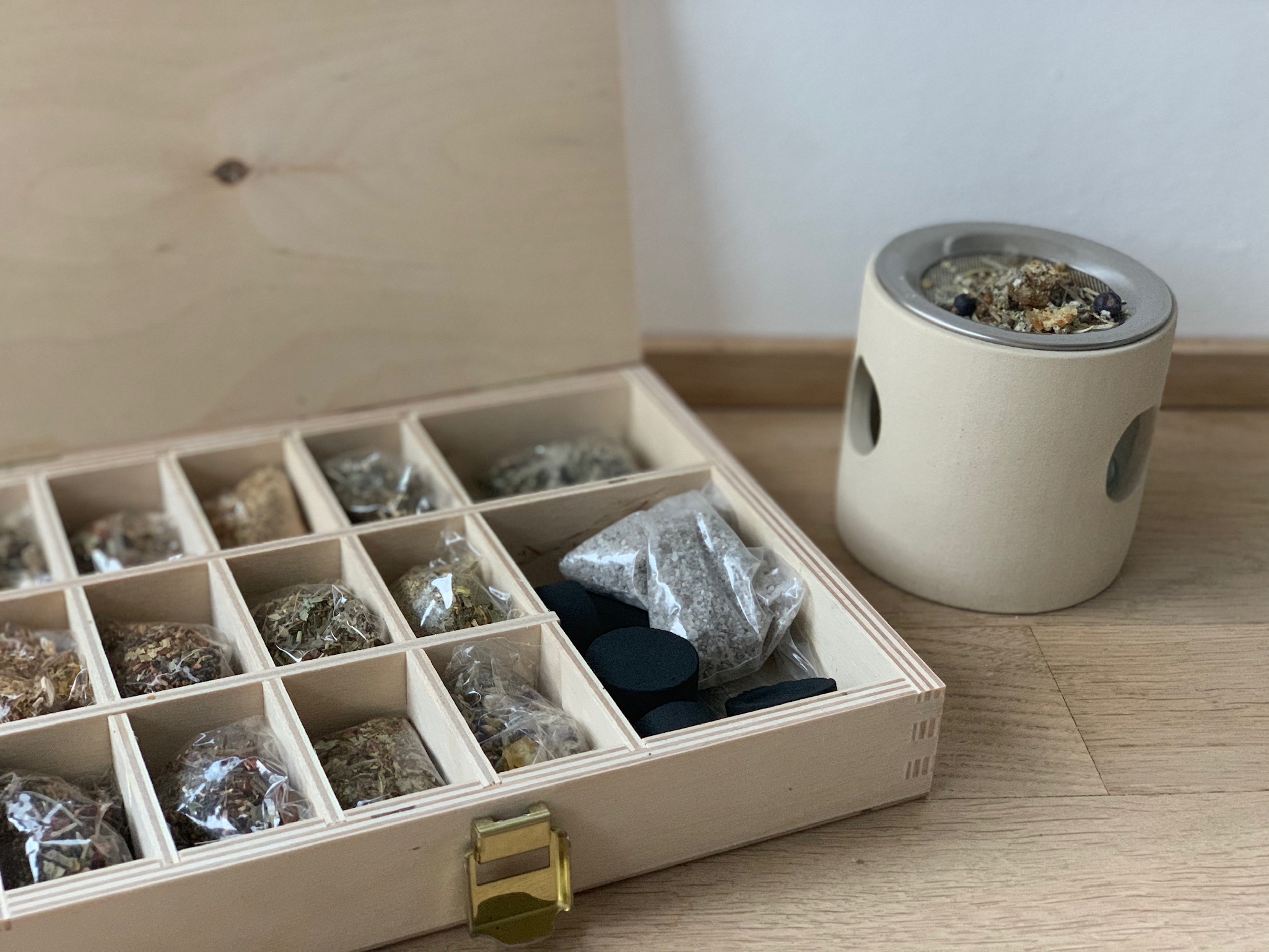 Mit dieser Kiste arbeite ich nun schon seit zwei Jahren und finde sie ganz wunderhttps://labdanum.de/bar! Es sind ausgesuchte Kräuter, Öle und Harze, Räucherkohle und Sand ist ebenfalls enthalten und sie ist sehr, sehr ergiebig.