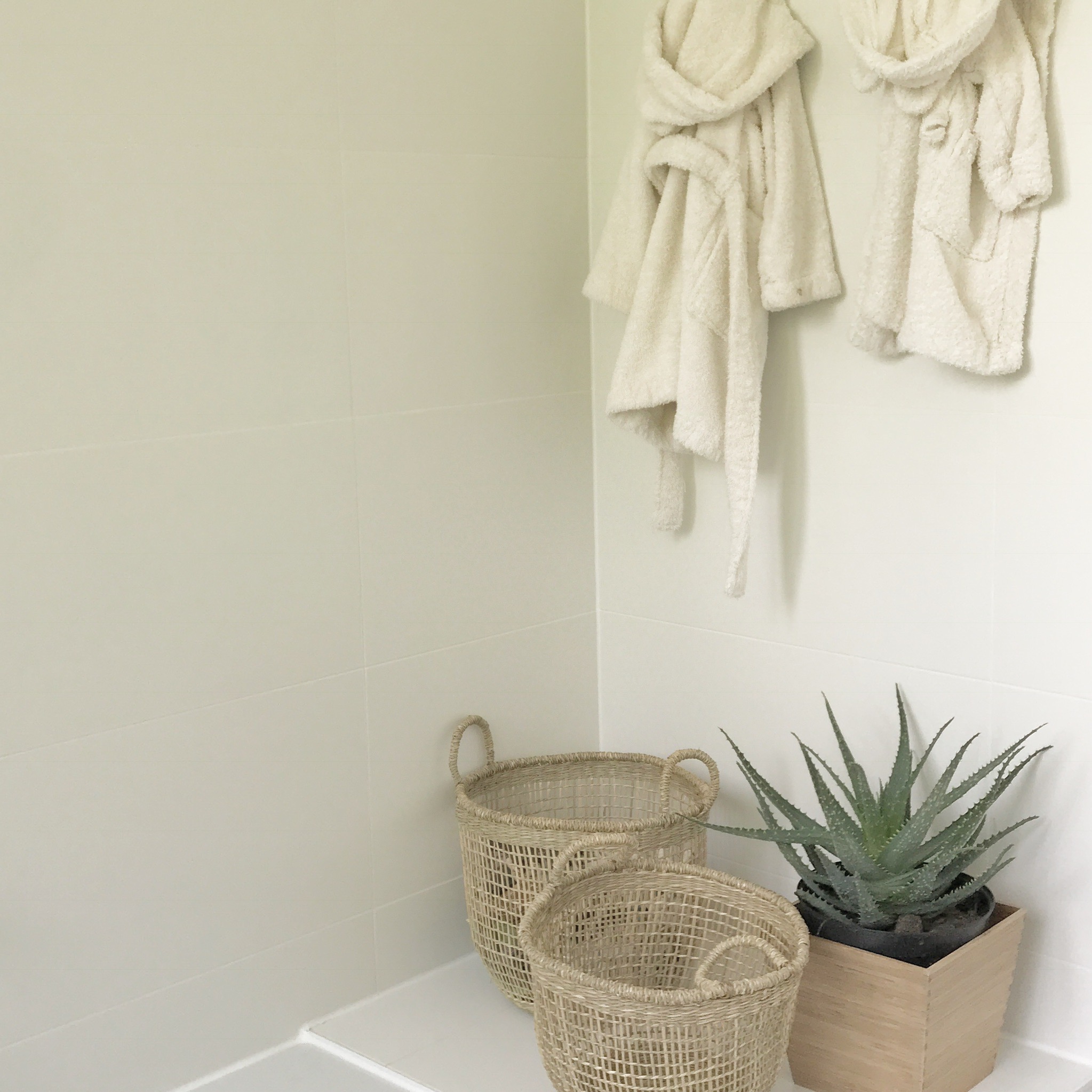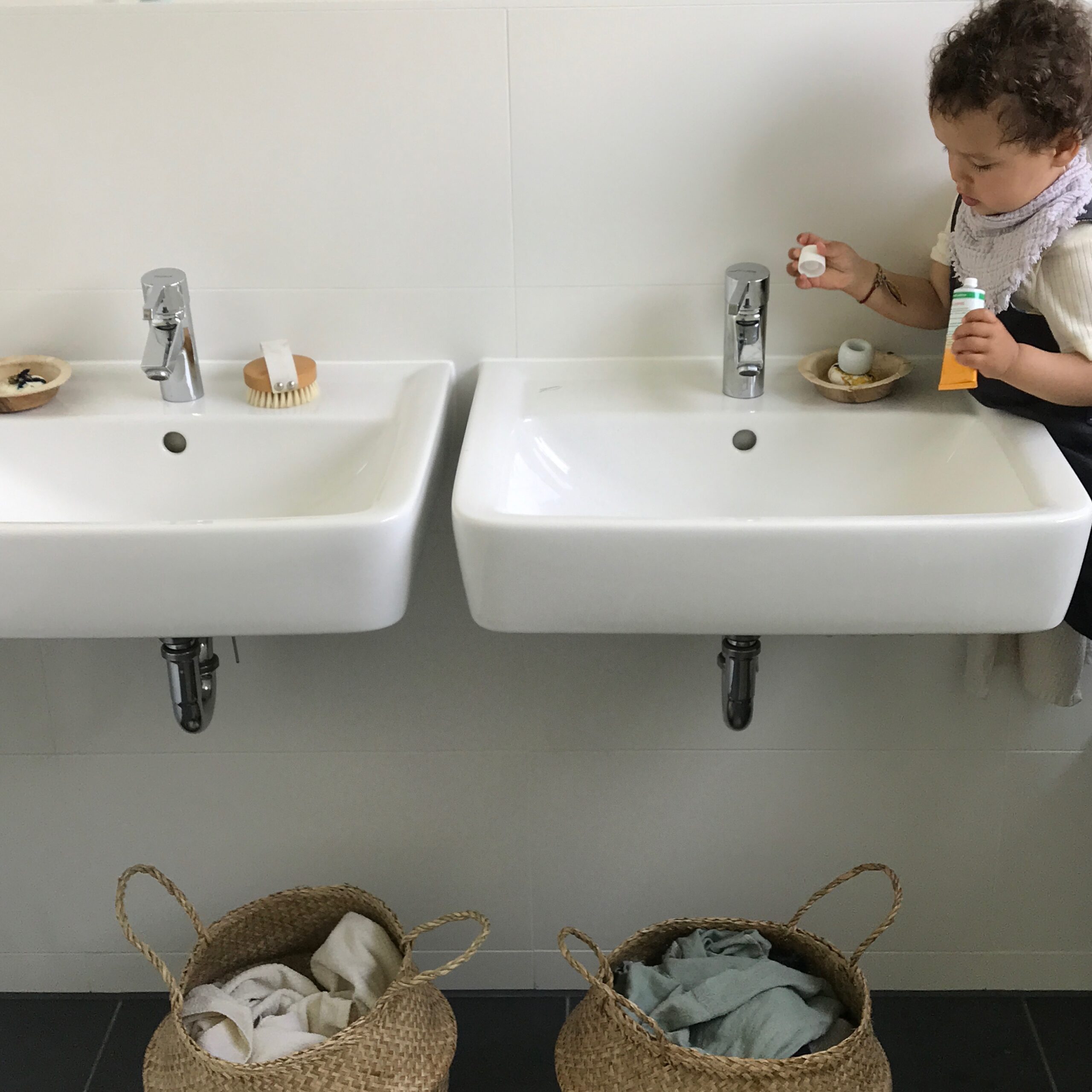 Unter den Waschbecken stehen zwei Seegras Körbe in die die Kinder ihre Wäsche sortieren sollen, der Plan ist, das die dreckigen Sachen nicht mehr einfach im Zimmer rumfliegen sondern im Bad ausgezogen werden und im besten Fall nach hell und dunkel sortiert in den Körben landen sollen. Ich bin gespannt ob es klappt und werde euch berichten!