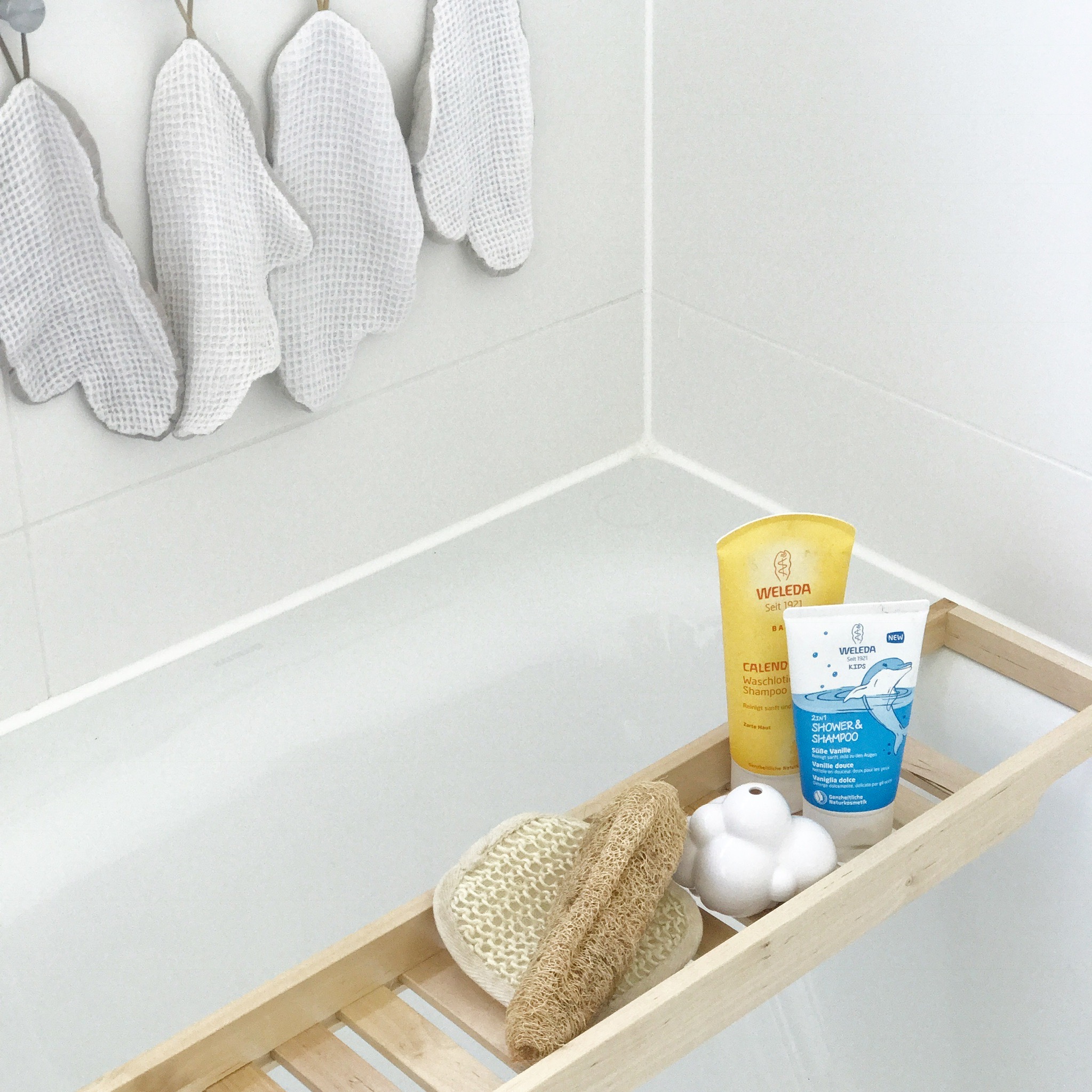 hier kommt Teil 1 unserer Haustour und ich beginne mit unserem Kinderbad. Ich kann immer noch nicht fassen, das wir nun ein extra Badezimmer haben nur für die Kinder! Das verrückteste an der Sache ist dass das Badezimmer der Kinder doppelt so groß ist wie jenes, das wir Jahrelang in unserer Mietwohnung gemeinsam benutzt haben. Ich mochte unser kleines Bad, in dem wir uns zu viert zum Zähnputzen um das kleine Waschbecken versammelt haben. Das sind schöne Erinnerungen die wir als Familie immer tief in uns bewahren werden. Es fühlt sich gerade auch noch ein wenig unwirklich an, so viel Platz zu haben, aber es ist natürlich total schön und ich bin unglaublich dankbar für all den Raum der uns nun umgibt. Ich habe versucht für die Kinder einen Raum zu erschaffen der ihnen ermöglicht selbständig alles machen zu können. Duschcreme, Haarbürsten, Waschlappen und Handtücher sind frei zugänglich. Jedes Teil hat sein zu Hause und so können die Kinder mit Leichtigkeit lernen Ordnung zu halten und alles an den richtigen Ort zurücklegen. An der Badwanne steht ein Korb mit all unseren Schleichtieren ,(da haben sich in den letzten 9 Jahren einige angesammelt) Laéna und Nael baden häufig zusammen und spielen dann gerne mit den Tieren in der Wanne. Ich finde es super, denn so haben wir nicht auch noch buntes Badespielzeug rumfliegen und die Doppelnutzung der Tiere finde ich total gut. Es gibt dann noch eine kleine Regenwolke die richtig regnen kann, sowie bei Bedarf Becher& Löffel aus der Küche. Auf dem Badewannenbrett stehen die beiden Lieblingsduschcremes von Weleda.Weleda hat sich nämlich für das Kid’s Shower & Shampoo drei wunderbare Wassertiere ausgesucht die wie ich finde auch perfekt zu dem Duft des jeweiligen Duschgels passen.Die neuen Weleda KIDS 2in1 Shower&Shampoos vereinen Duschgel und Shampoo in einem und reinigen zarte Kinderhaut und Haare besonders sanft. Pflegendes Bio-Sesamöl, milde Zuckertenside und drei tolle Düfte sorgen für viel Freude beim Duschen und Shamponieren – und das mit Inhaltsstoffen 100% natürlichen Ursprungs. es wurde speziell entwickelt für Kinder ab dem 3. Lebensjahr, ist aber natürlich für die gesamte Familie geeignet (ich mag es es auch sehr gerne ). Natürlich ist es wunderbar Hautverträglichkeit dermatologisch getestet 100% natürlichen Ursprungs – ganz bewusst ohne synthetische Duft-, Farb- und Konservierungsstoffe sowie Rohstoffen auf Mineralölbasis. Wie nicht anders zu erwarten ist es im Einklang mit Mensch und Natur entwickelt wurden.