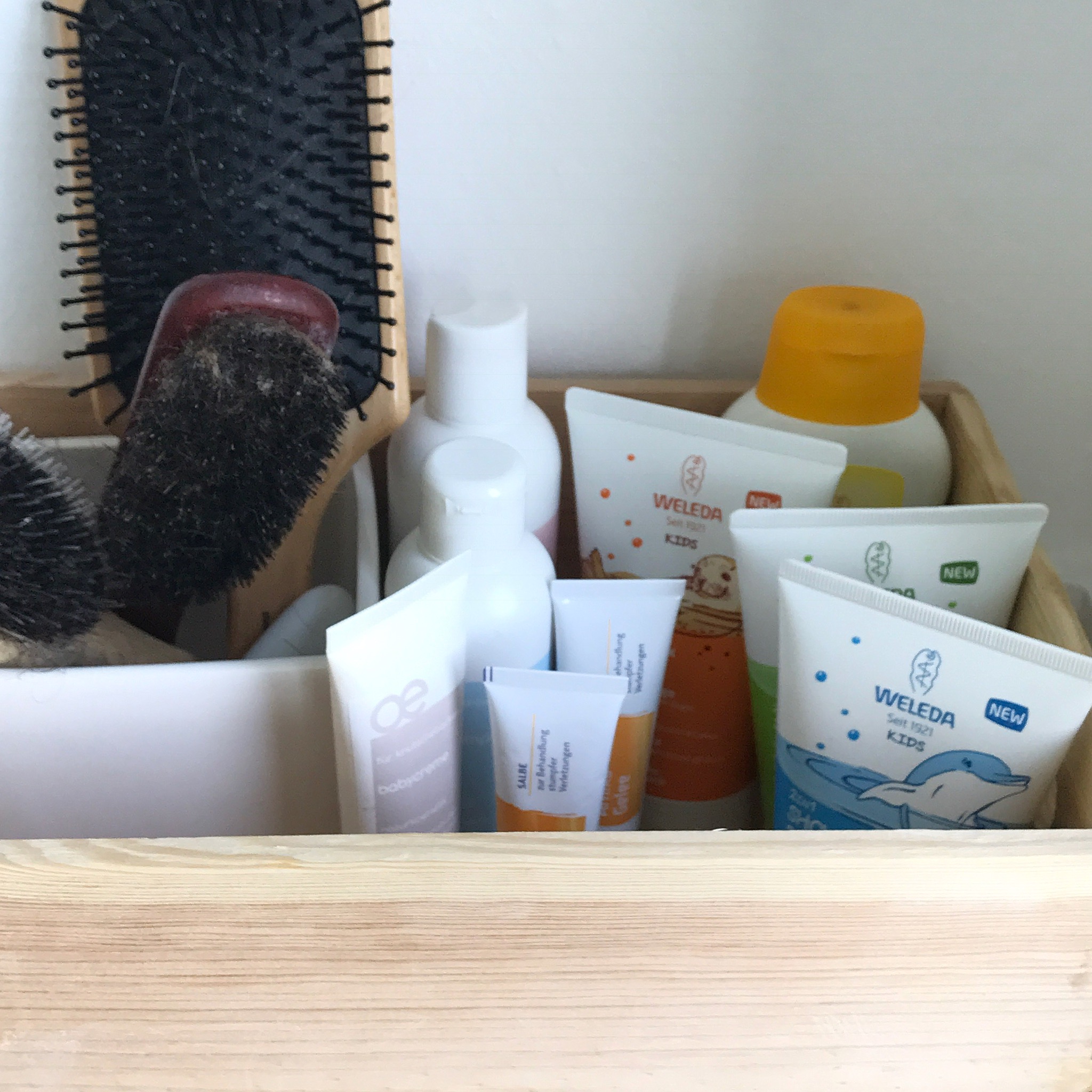 Das Kinderbad, die Arnika Salbe für Notfälle, Pflaster, Pinzette Zeckenzange sind nur in Reichweite der großen Schwester und uns Eltern erreichbar, aber immer griffbereit, so wissen wir alle im Notfall wo die wichtigsten Sachen zu finden sind. Die Haarbürsten sind gerade auch noch in dem Holzkörbchen ganz oben, denn Nael tut gerade nichts lieber als das braune Kinderbad in der Badewanne zu verteilen und mit der Haarbürste lustige Bilder in die Wanne zu malen. Komischerweise fallen ihm nur die zwei Dinge zum Opfer alles andere nicht. Uns fehlen noch pro Kind ein kleines Körbchen mit Platz für individuelle eigenen Dinge. Für unseren Kleinen ist es noch nicht zwingend notwendig aber Laéna braucht so ein Körbchen für ihre Haargummis, Kindernagellack, Ketten etc. Ich dachte mir, durch diese Körbchen lernen die Kinder zugleich das Eigentum anderer zu achten, ich denke es ist ganz gut früh genug damit zu beginnen und durch so einfache kleine Dinge innerhalb der Familie lernen sie sozusagen fürs Leben.