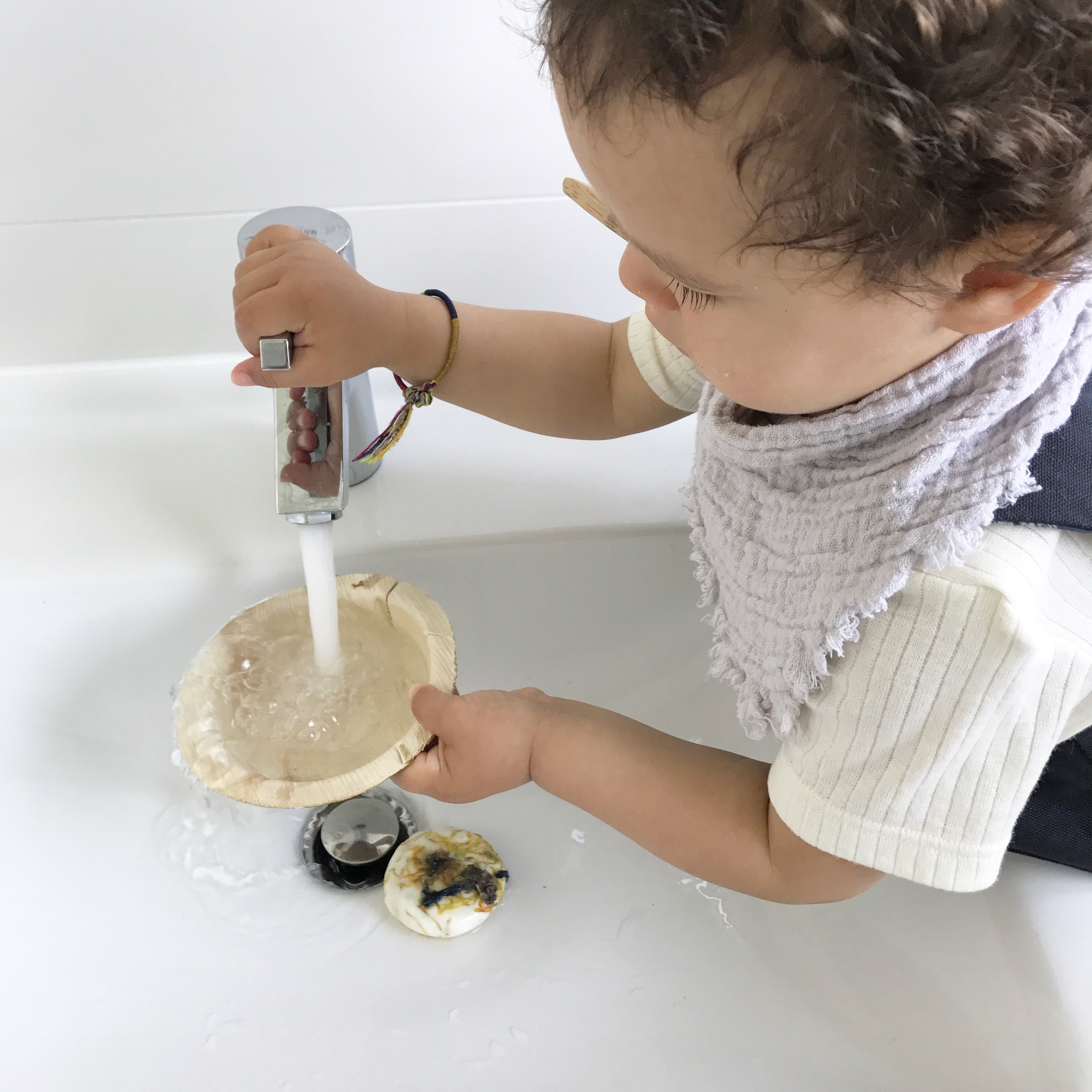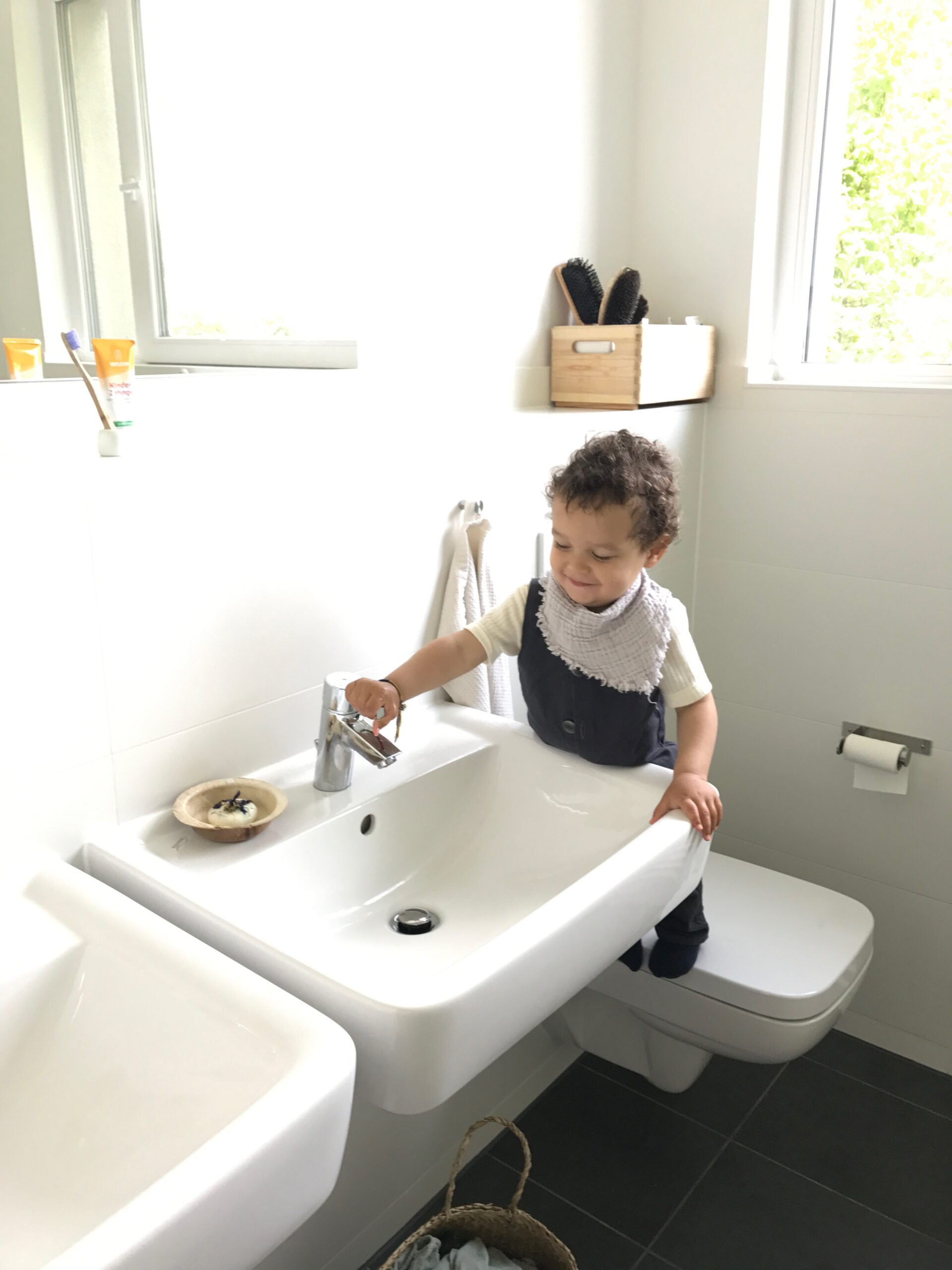 Nael hat übrigens keinen Waschbecken Hocker, denn er will ihn einfach nicht benutzen! Er klettert lieber auf die Toilette und wäscht sich von dort aus die Hände und putzt Zähne. Ich habe natürlich immer ein wenig Sorge das er runterfällt aber das würde ich mir natürlich nie anmerken lassen, denn Nael liebt seine gerade gewonnene Selbstständigkeit und so ist in den nächsten Wochen einfach noch ein wenig Obacht geboten und ich muss immer in Reichweite stehen, wenn er am Waschbecken vor sich hin pütschert. Doch an sich habe ich ziemlich großes Vertrauen in meinen Sohn auch wenn er klettert wie ein Weltmeister draue ich ihm jetzt schon zu das er keine Grenzen überschreitet. Doch natürlich begleite ich ihn bei all seinen Unternehmungen damit auch wirklich nichts passiert.