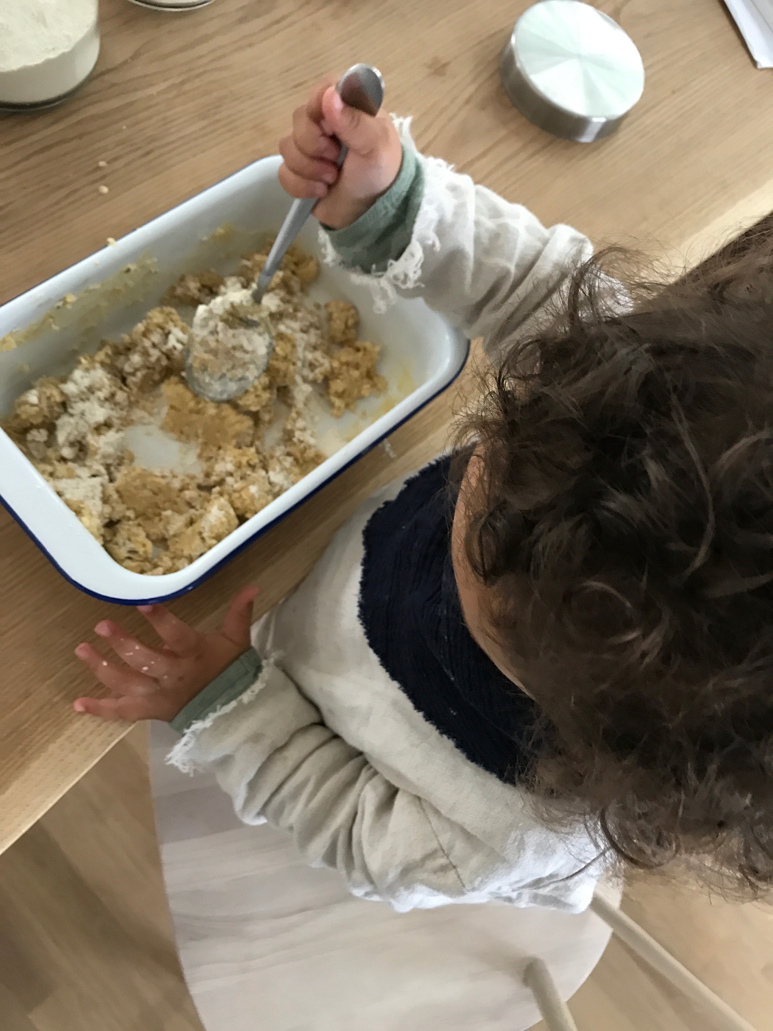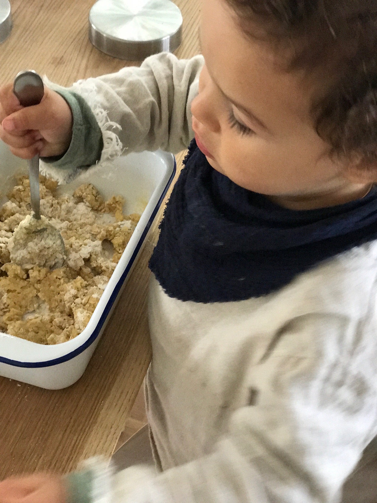 Nun die Streusel herstellen: dafür einfach alle Zutaten in die Küchenmaschine geben und durchkneten, wenn ihr kleine Kinder habt ist es auch eine Arbeit die die Kleinen gerne anstelle der Maschine übernehmen können, Nael liebt es! Der Teig muss schön krümelig (steuselig sein) Wenn ihr das Gefühl habt der Teig ist nicht streuselig genug dann gebt einfach noch etwas Mehl hinzu! Das schöne an diesem Rezept ist man kann nicht so viel falsch machen, ihr könnt auch die Zutaten nach Lust und Lauen varieren und es kommt immer etwas leckeres dabei raus! Ich habe den Crumble auch schon mal mit unserem Kokos oder Schokogranola gemacht anstelle der Haferflocken, auch super lecker .