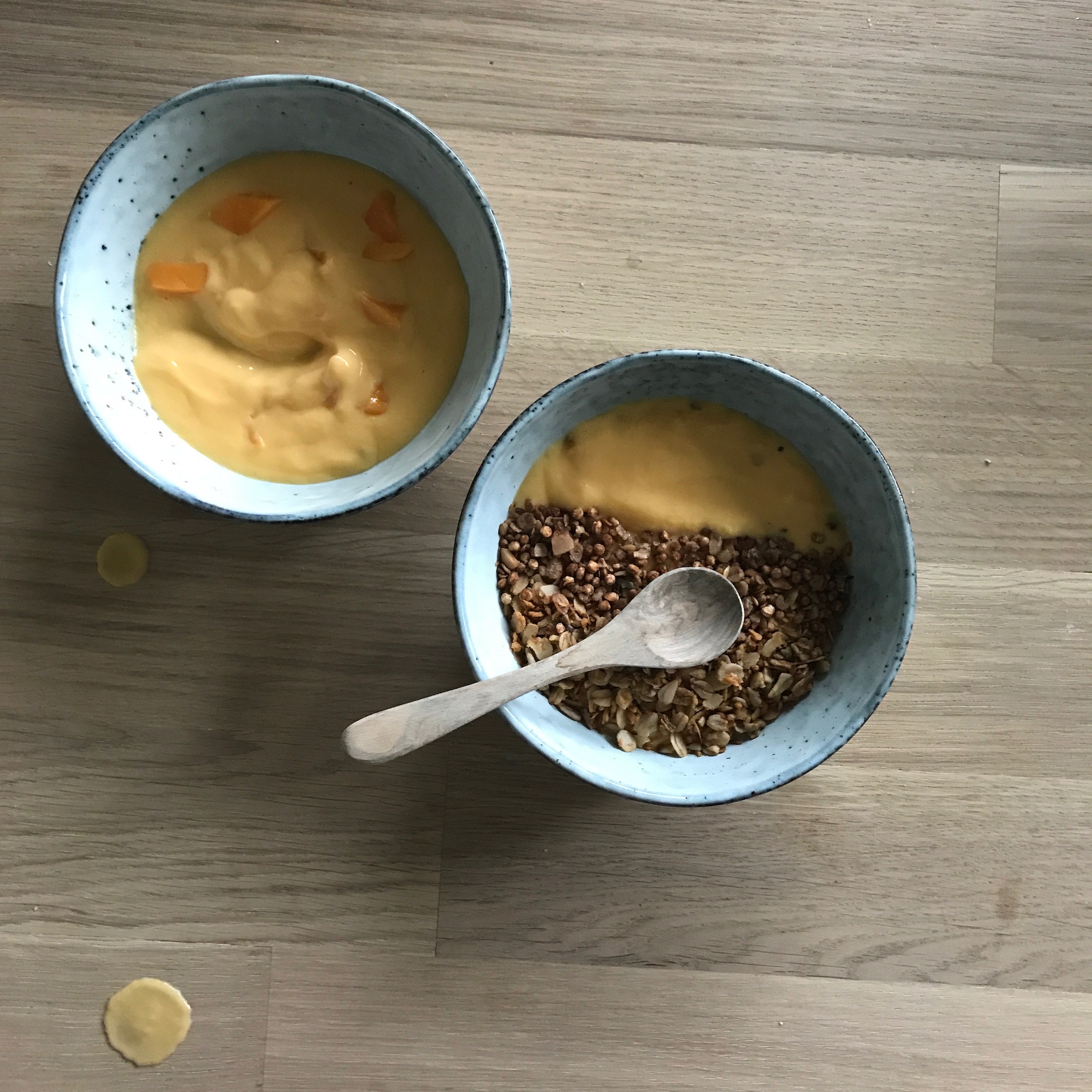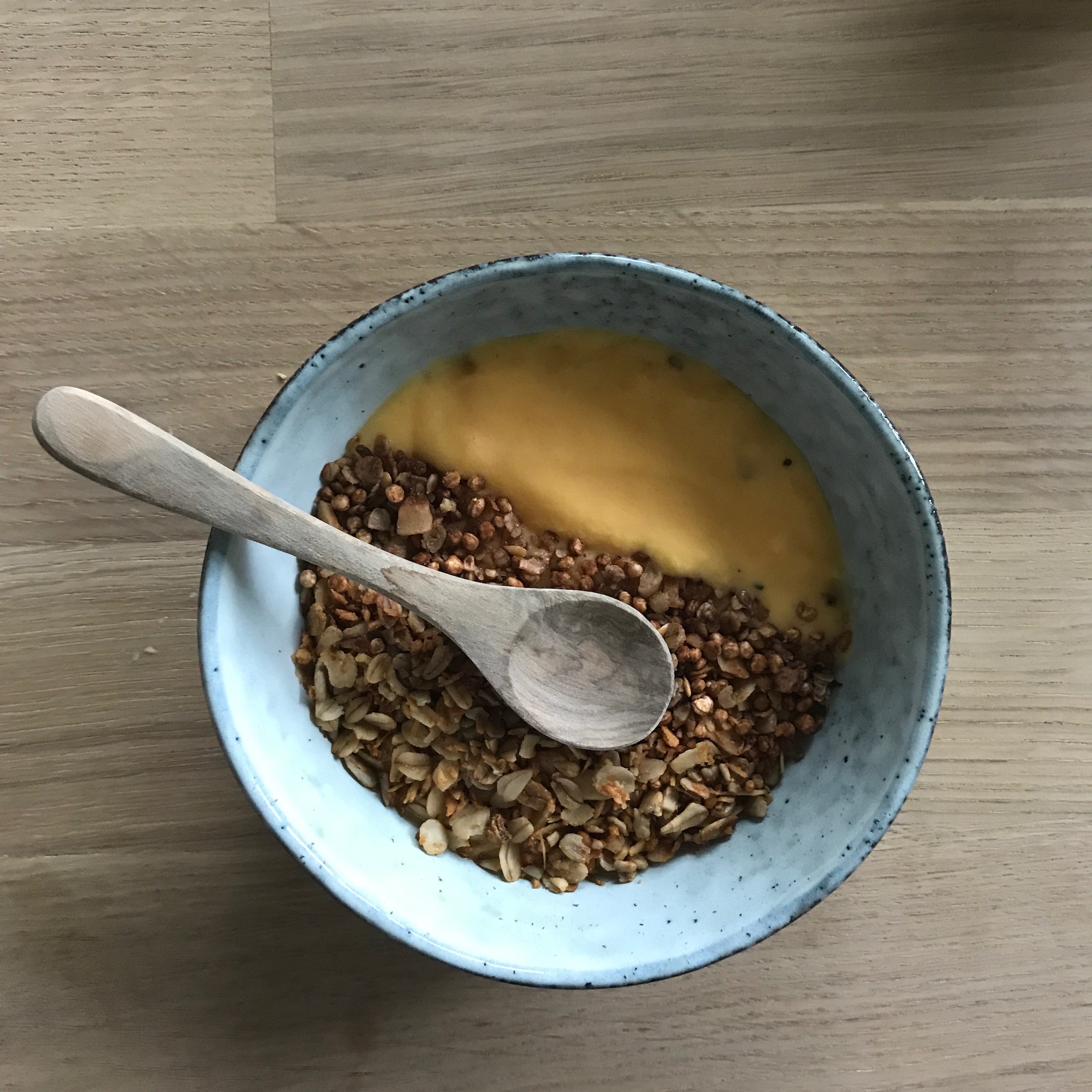 Heute gab es frischen selbstgemachten Joghurt mit frischer Mango im Winter geht es natürlich auch gut mit Mango aus dem TK. Wie wir den schnellen Fruchtjoghurt ohne Zucker machen findet ihr hier (klick )