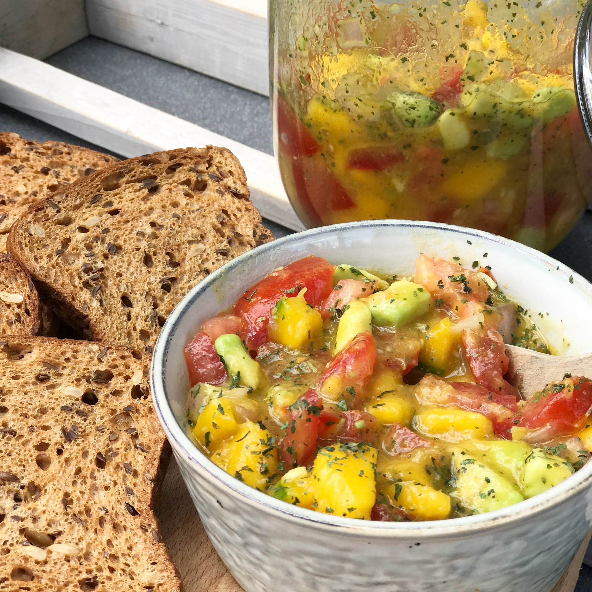 Das Obst und Gemüse würfeln, den Saft der Limone drüber geben mit Olivenöl aufgießen. (2-3 Löffel) Mit Pfeffer und Salz abschmecken die Kräuter unterrühren. Fertig! Wenn ihr es gerne etwas schärfer mögt, eine Peperoni durchschneiden, die Kerne entfernen und mit untermischen, gegebenenfalls nach einer halben Stunde wieder entfernen.