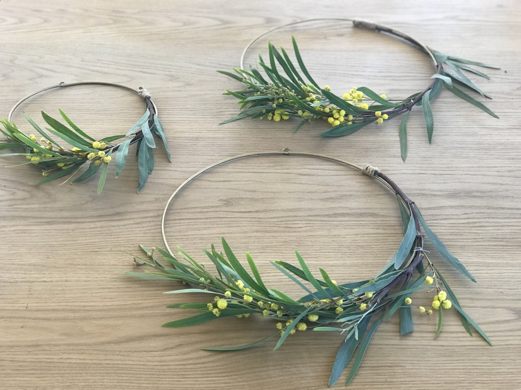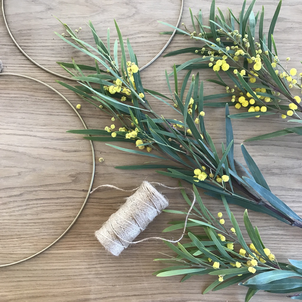 - Die Mimosenzweige zurechtlegen auf dem Kranz zurechtlegen