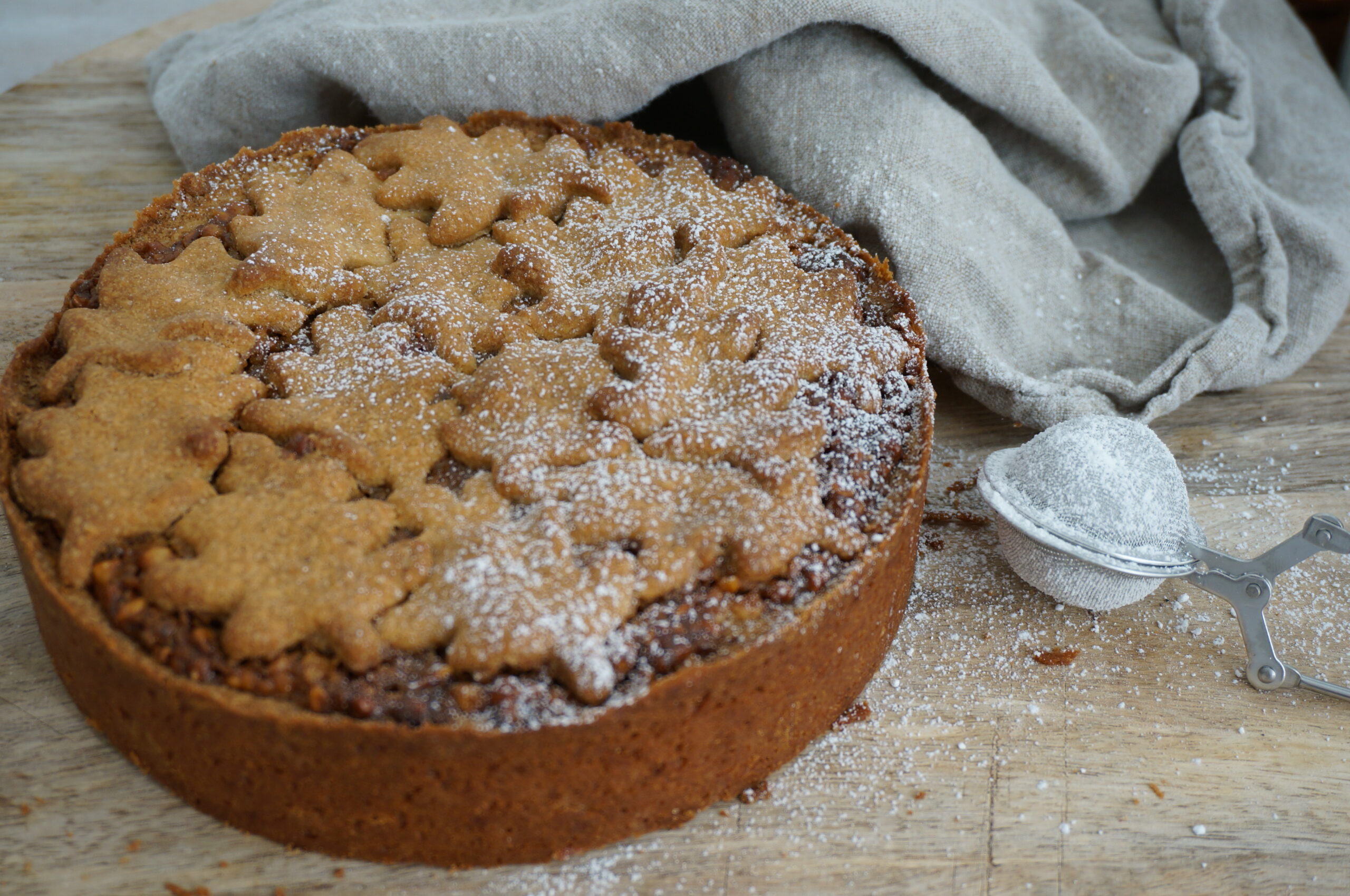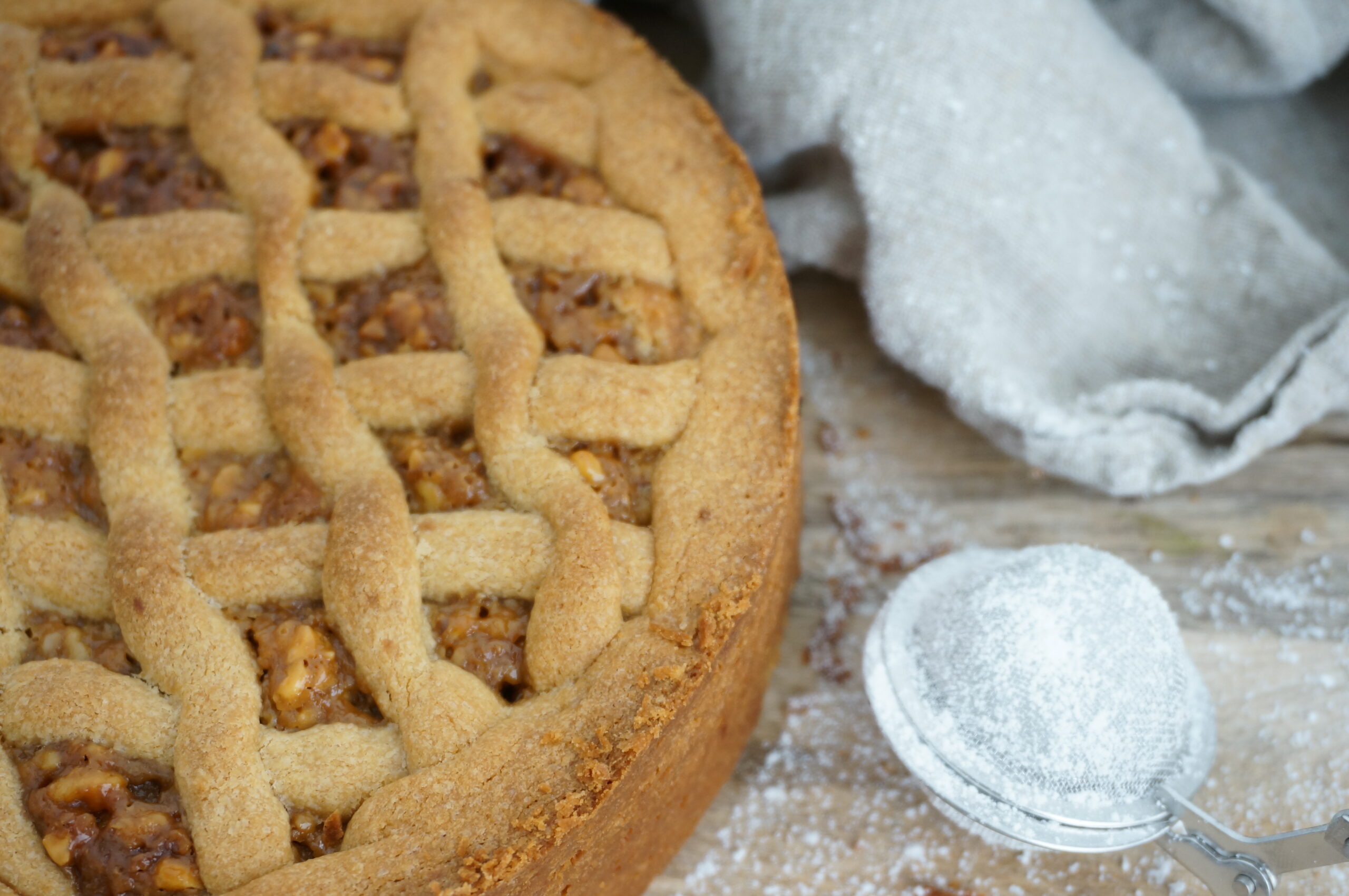 300-400 g Walnüsse in der Küchenmaschine grob hacken (ich habe 300 g Walnüsse und 100 g Haselnüsse genommen) 20 g Butter und 180g braunen Zucker schmelzen, karamellisieren und mit Sahne ablöschen. Nun das Ganze so langen köcheln lassen bis ein sahniges Karamell entsteht. Das Karamell über die Nüsse geben, gut vermischen und auf den Kuchenboden verteilen. Ich habe zwei kleine Formen gemacht, das Rezept reicht aber auch genau für eine normale große Springform. Nachdem die Nussmischung verteilt ist, muss nur noch ein Teig-Gitter geformt werden oder aber ihr stecht kleine Blätter aus und dekoriert sie auf den Kuchen. Nun das Ganze bei 180° für etwa 45 Minuten backen. Fertig !