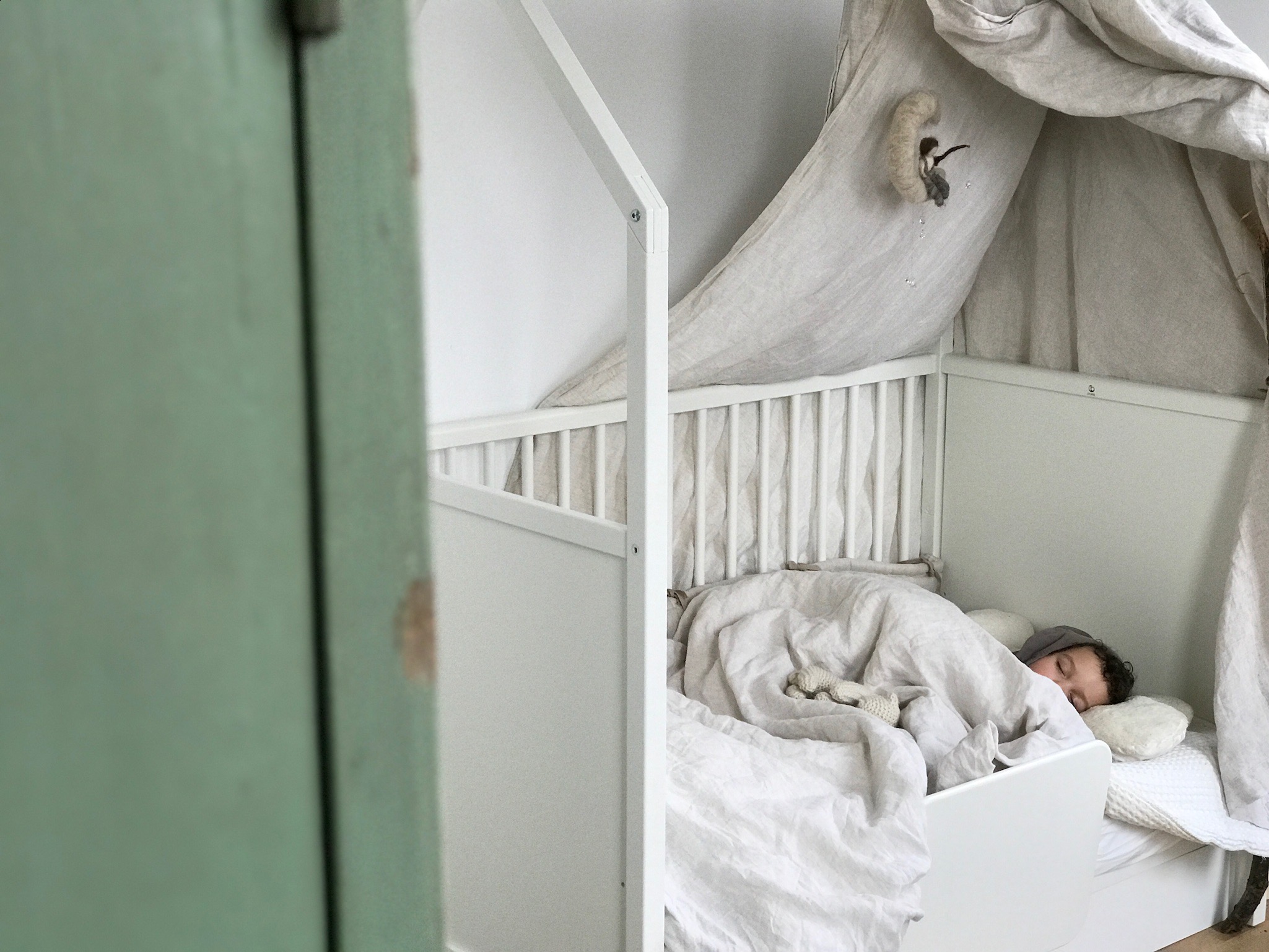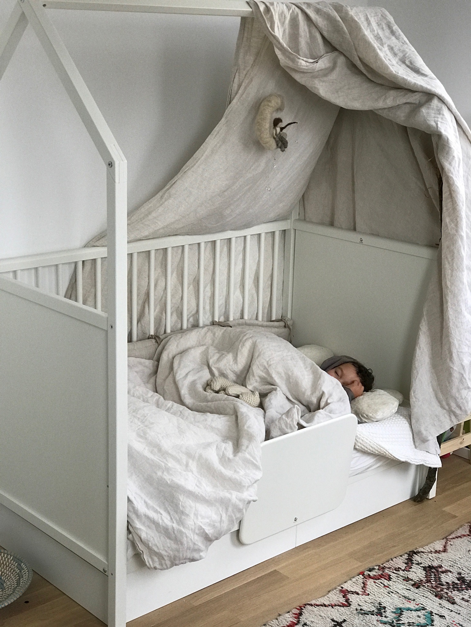 Seitdem es das kleine Home Bett geht bin ich verliebt in dieses Kuschelige kleine Bettchen. Nael ist eigentlich ein begeisterter Familienbettschläfer, Mittags wiederrum schläft er gerne in seinem Zimmer und vor allem liebt er es in seinem Kuschelbett zu spielen und zu kuscheln. Ich hoffe das er ganz bald auch Nachts im neuen Bett (durch)schläft und nicht nur dort einschläft. Auf jeden Fall hat dieses kleine schöne Bett alles was ich mir von einem Kinderbett wünschen kann, es hat genau die richtige Größe, die Kinder fühlen sich darin geborgen aber es es ist auch nicht zu klein, so dass es babymässig aussieht. Das Dach läd dazu ein Höhlen zu bauen und für kleinere Kinder kann oben noch ein Mobile aufghängt werden . Den schönen Mond aus Schafwolle mit dem Jungen hat Nael zu Taufe bekommen und ich finde es gibt dem ganzen noch Elfenzauber, der in keinem Zimmer fehlen darf.