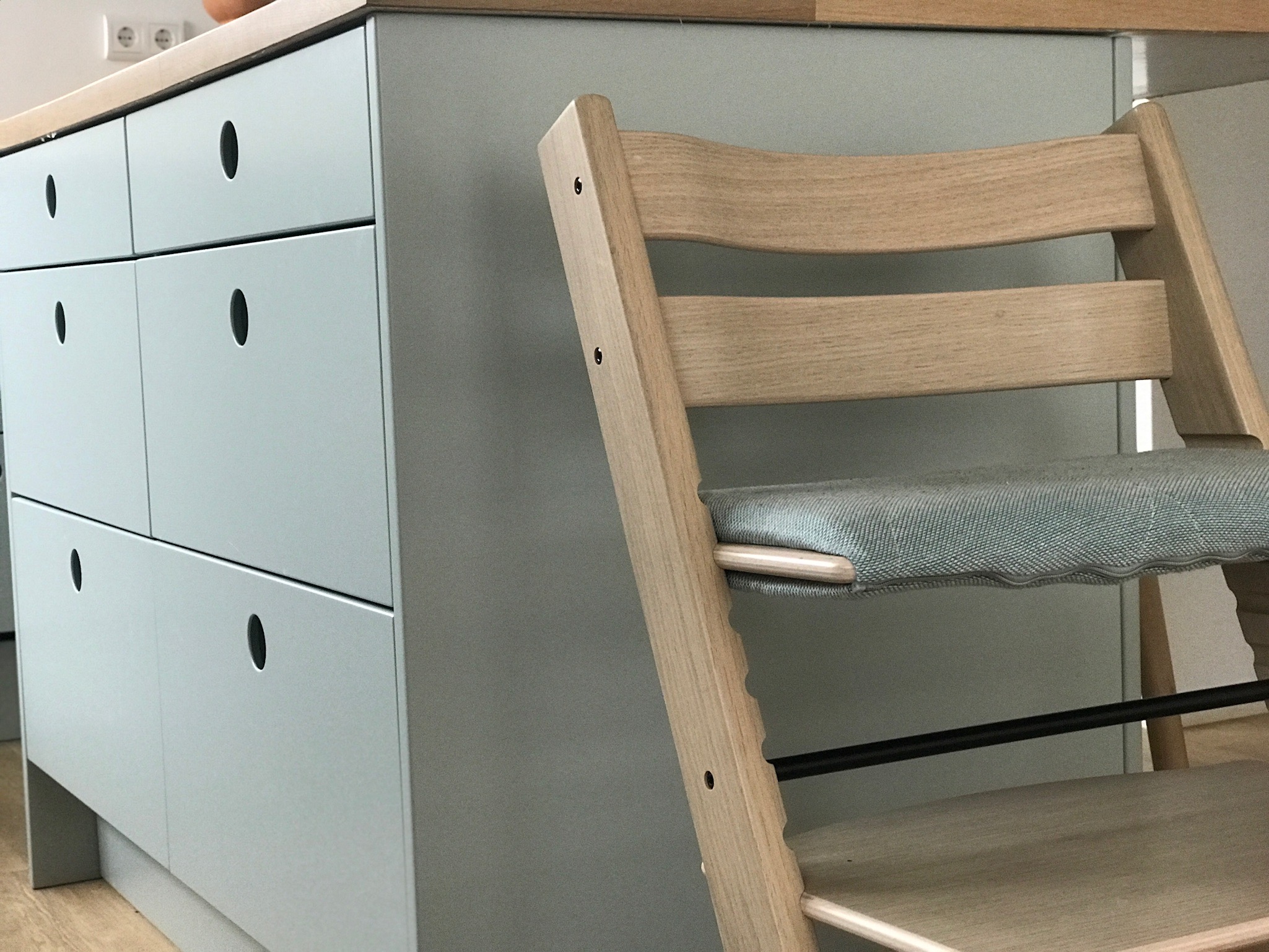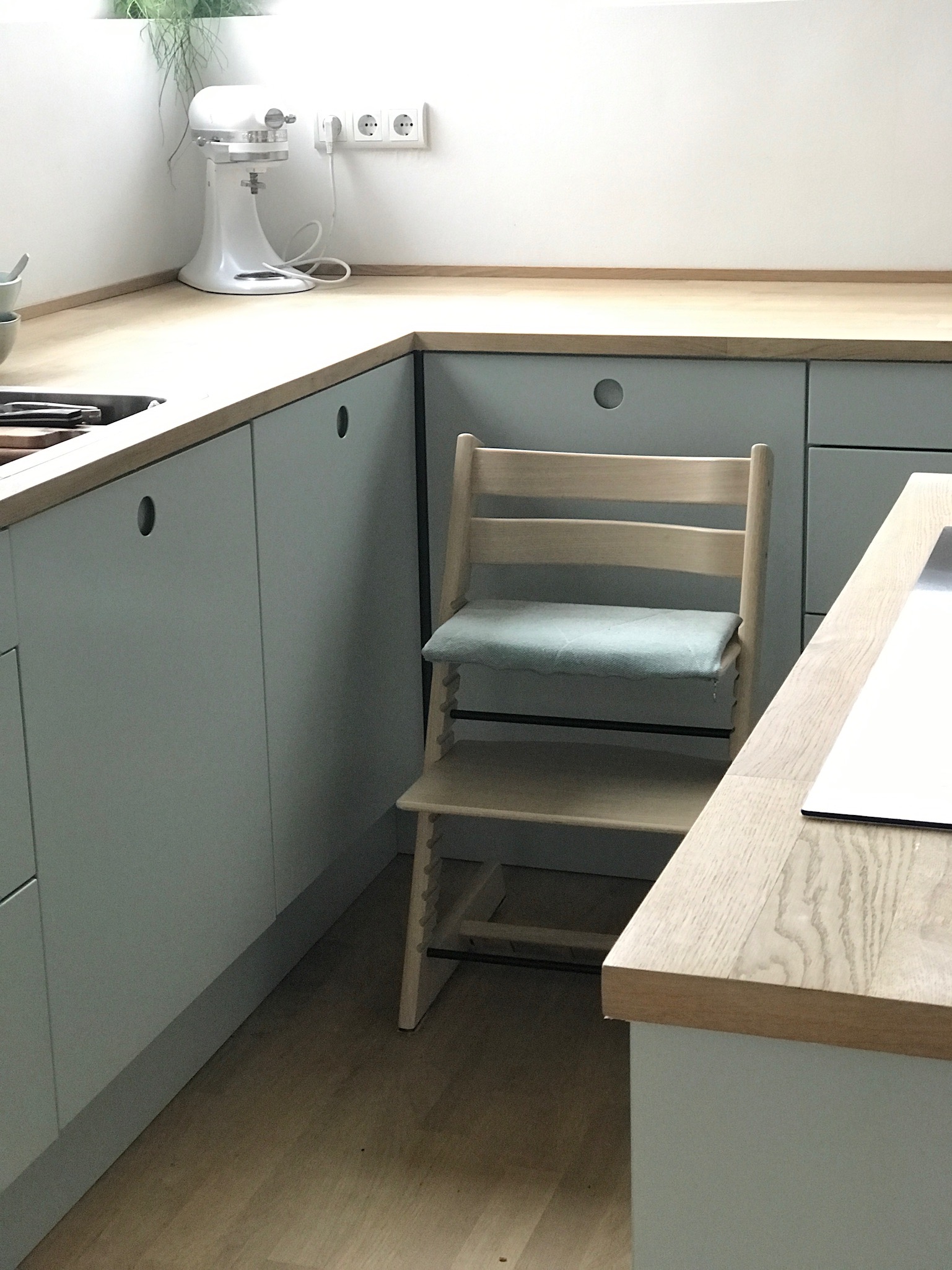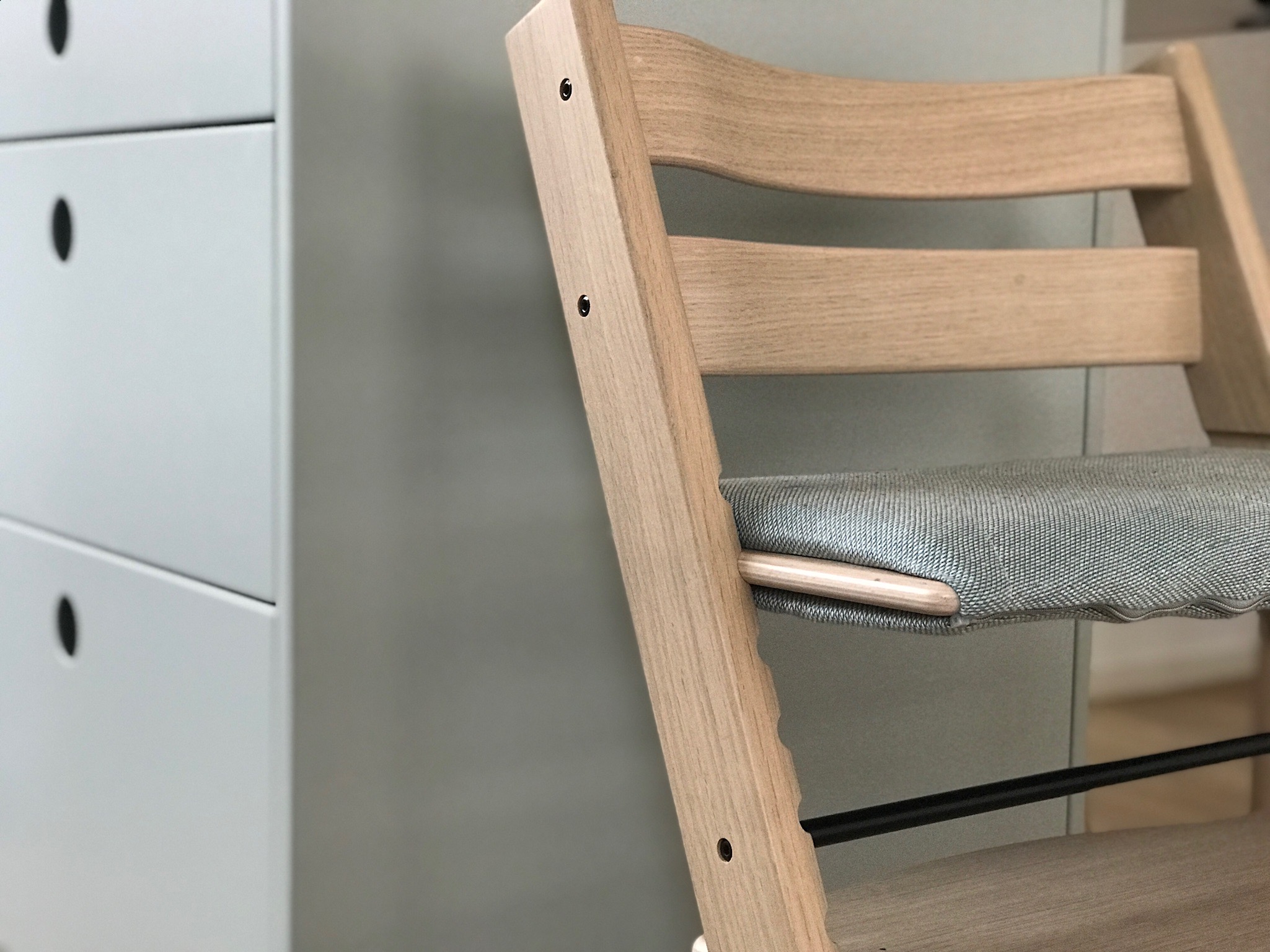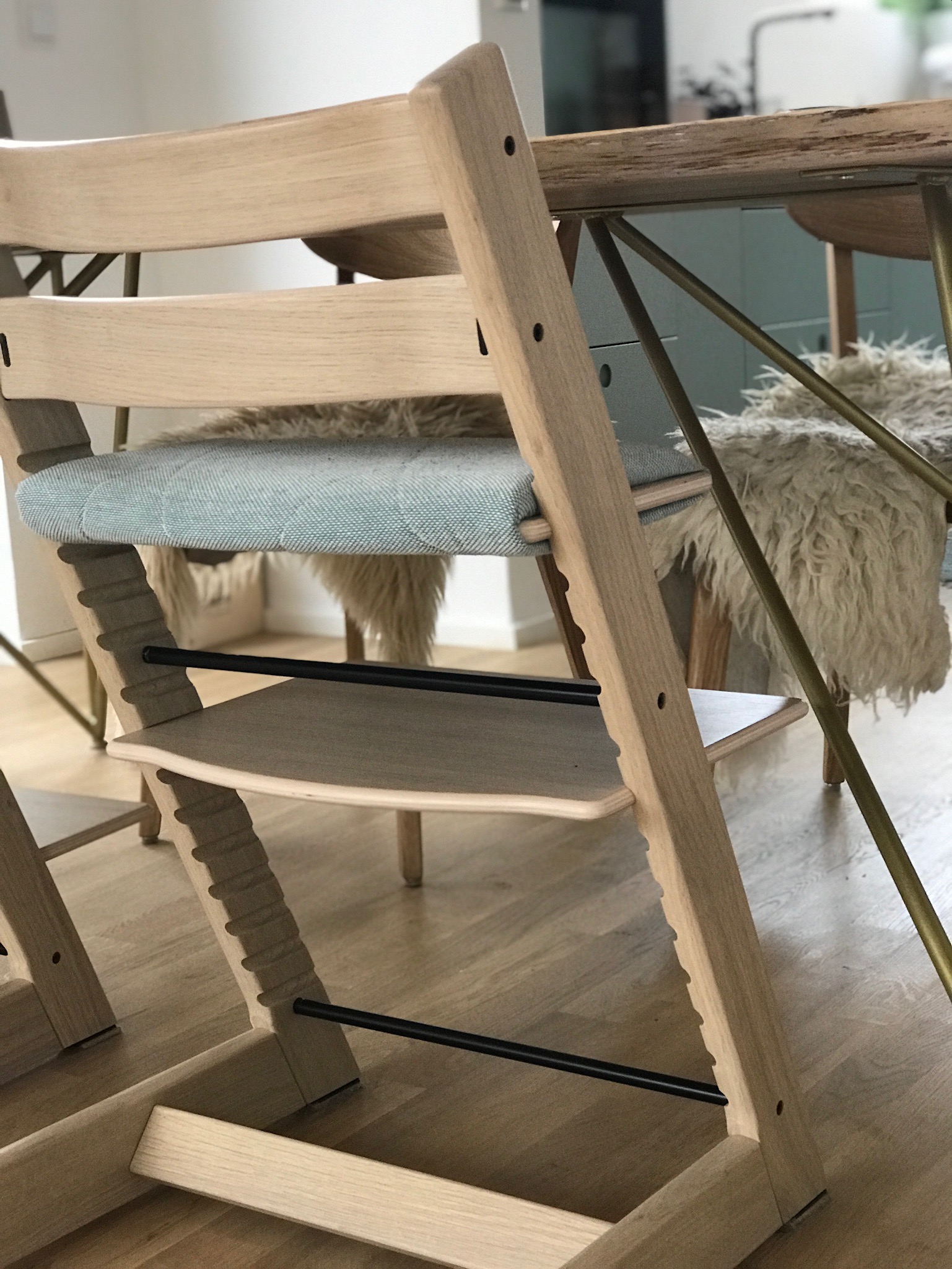 Ich hatte sofort das Sondermodell im Kopf das es letztes Jahr für kurze Zeit gab. Ein Tripp Trapp aus Eiche! Wie es der Zufall will, kamen kurze Zeit nach unserem Einzug tatsächlich neue Tripp Trapp Farben auf den Markt und ich hatte Glück! Natureiche hell geseift (genau wie unser schöner Boden). Ich musste nicht lange überlegen, die beiden Stühle durften inkl. neuer grüner Sitzpolster bei uns einziehen! Sie sind aus der neuen Oak Serie von Stokke und das Junior Kissen in grün ist sooo schön!