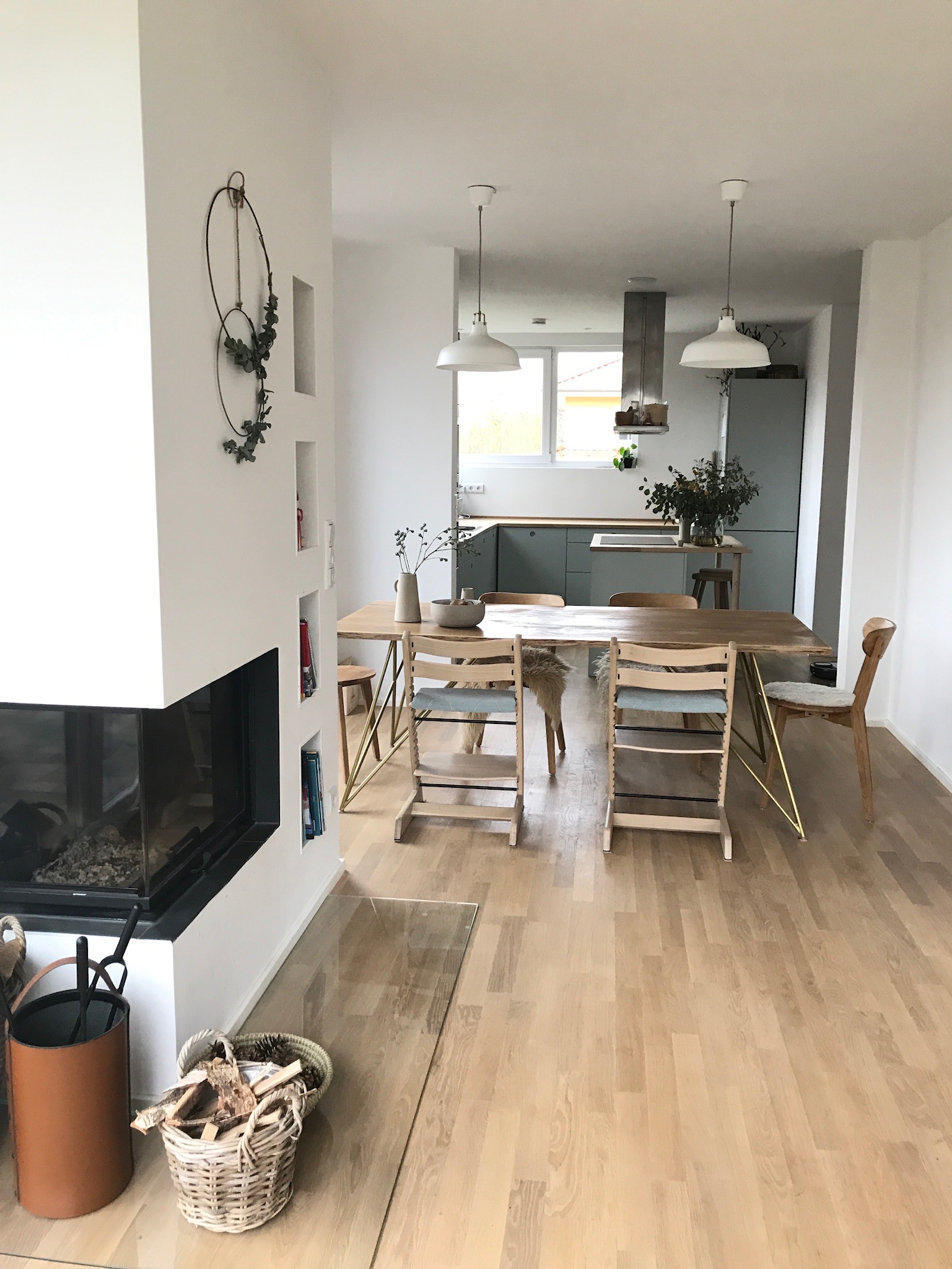 Wir beginnen im Wohnzimmer! Bzw. im Esszimmer, ich würde behaupten es ist das Herzstück in unserem zu Hause! Ich habe lange lange nach dem richtigen Tisch gesucht, denn ich wollte etwas besonders aber doch natürliches, aus Eiche sollte er sein und sich in das Bild, also dem Blick vom Wohnzimmer in die Küche gut einfügen.Einen Tisch Gebaut für die Ewigkeit mit einem besonderen Gestell. Nachdem ich ihn mehr oder weniger um die die Ecke in dem Showroom von des schönen jungen Berliner Labels NUTS&WOODS gefunden hatte, er in unserem Haus stand und voller Schönheit den Raum erstrahlte, musste ich leider feststellen das unsere alten sehr geliebten Kinderstühle nicht so recht ins Bild passten und auch irgendwie ein Stück zu groß waren für den nicht ganz großzügigen Raum der für Tisch und Stühle vorgesehen war. Ich wünschte mir wieder den ganz normalen Tripp Trapp zurück, das zeitlose Design das sich auch hier ganz wunderbar einfügen würde.Unsere Wände sind übrigens alle ganz klassisch Weiß gestrichen mit Alpina : Alpinaweiß Unsere Beste – weiße Innenfarbe (Konservierungsmittelfreie Wandfarbe für Innen)