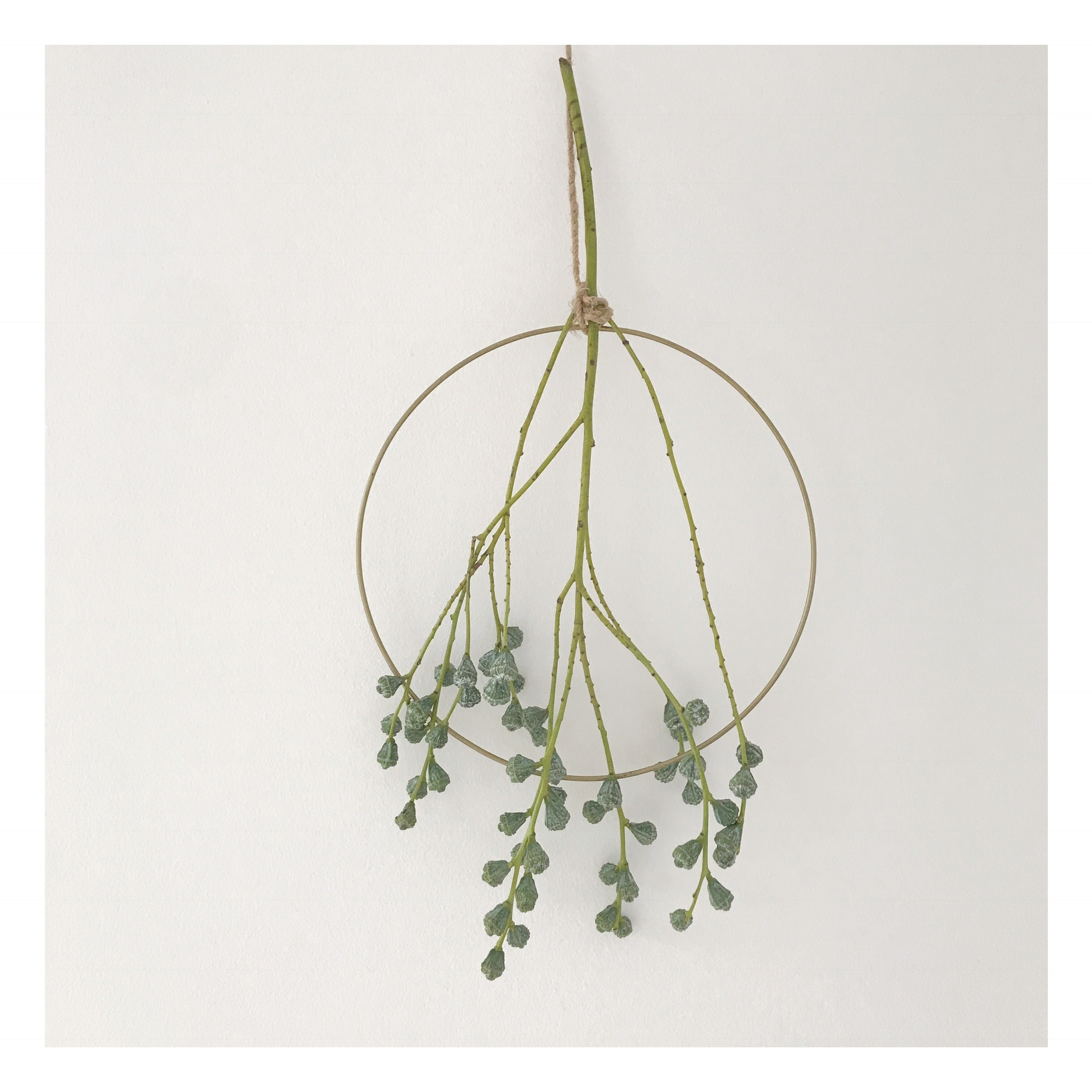 Ich bin in einem kleinen feinen Shop aus Köln fündig geworden, der den hübschen Namen Mill Vintage trägt. Dort gibt es dunkel goldene Rohlinge in drei verschiedenen Größen. Der große hängt bei uns in der Tür. Sie fühlen sich super wertig an, haben ein gutes Gewicht und eine schöne Farbe. Und es kommt noch besser, sie sind nicht teuer! In dem Shop gibt es übrigens auch hübsche kleinen Vasen und Grünpflanzen. Aber nun zu den Kränzen. Hier seht ihr die drei Varianten, die ich gestern gemacht habe. Für das Kinderbad und unser Schlafzimmer werde ich morgen noch welche machen. Mal schauen, wie die aussehen werden!