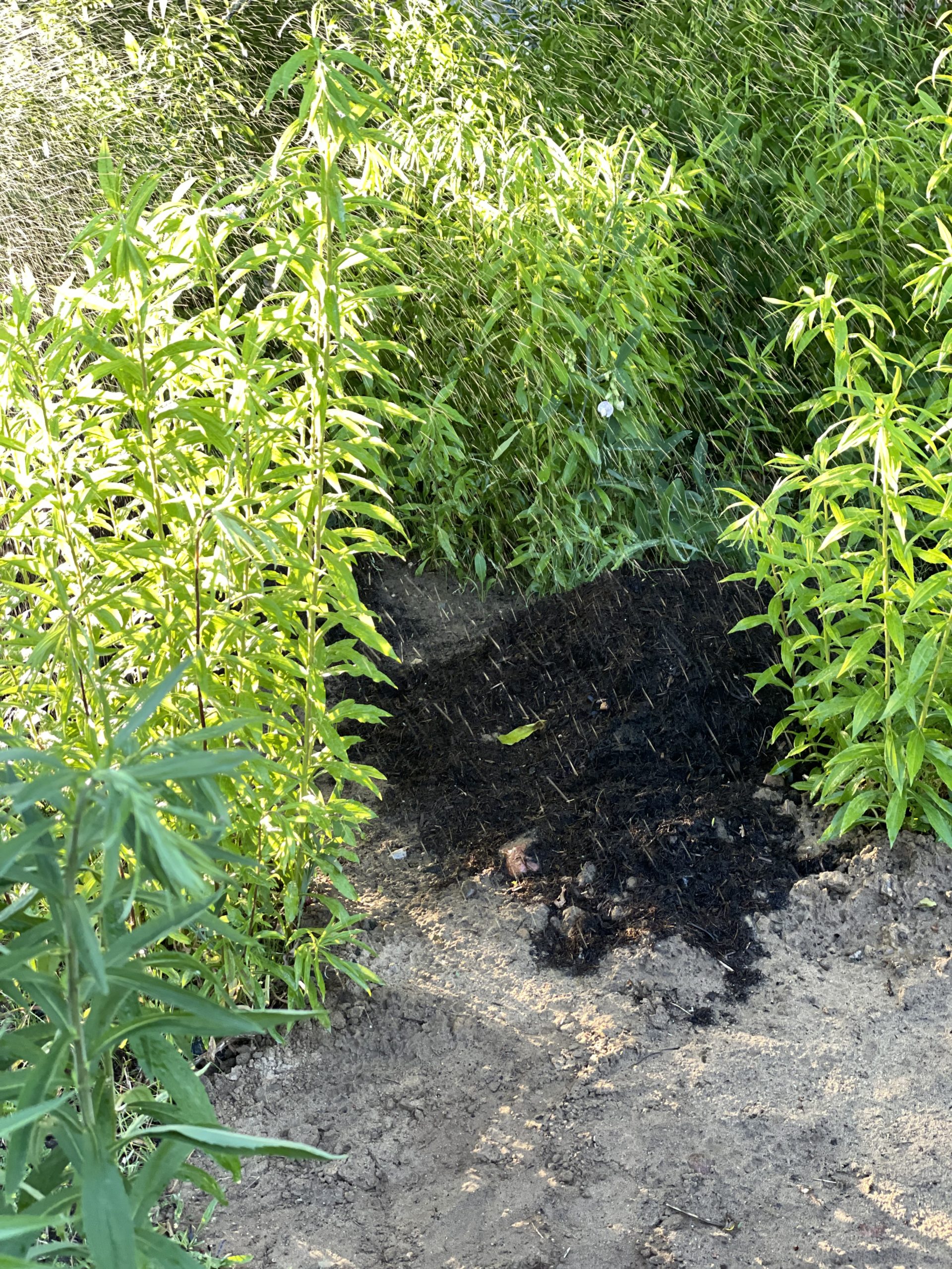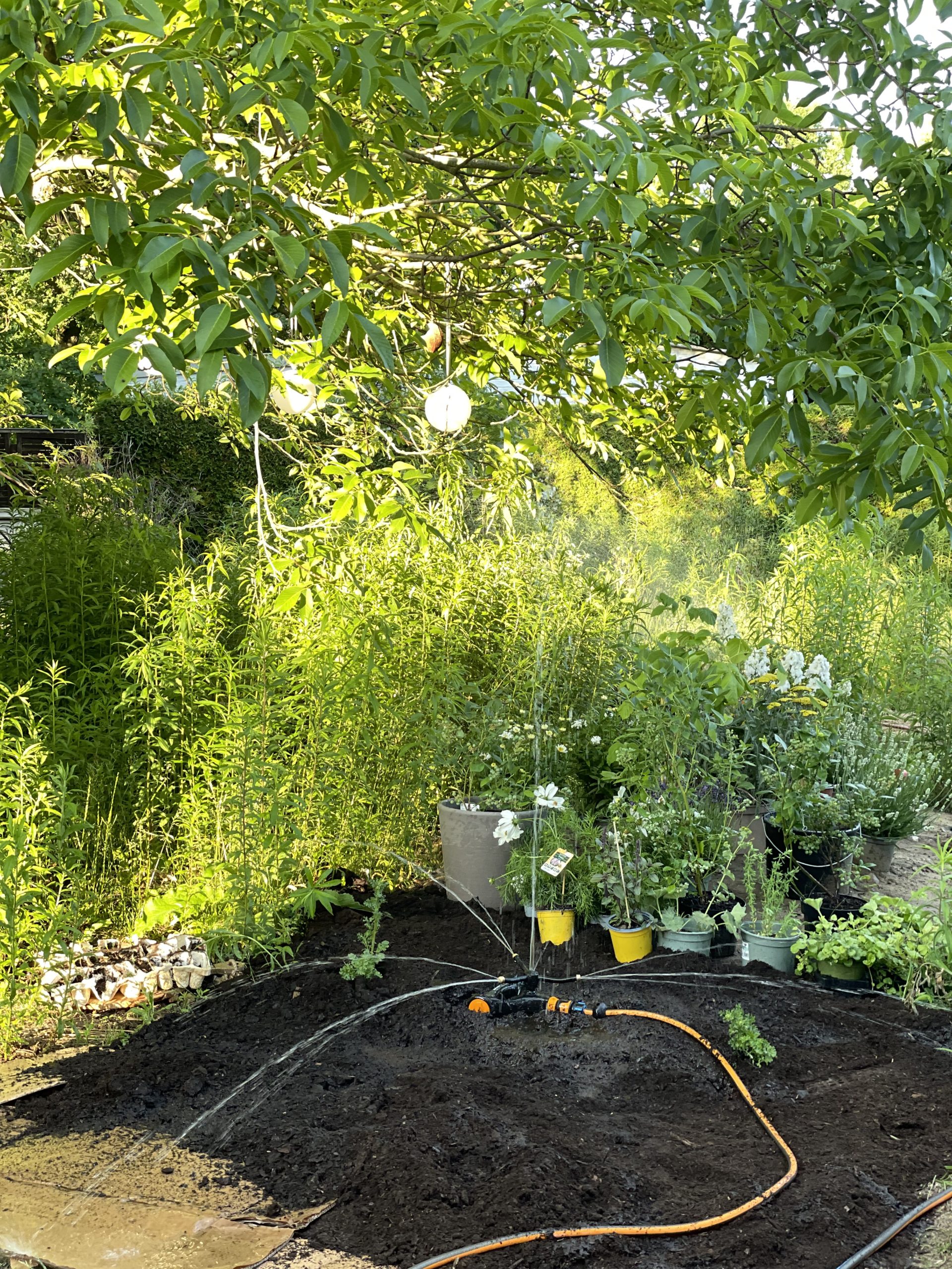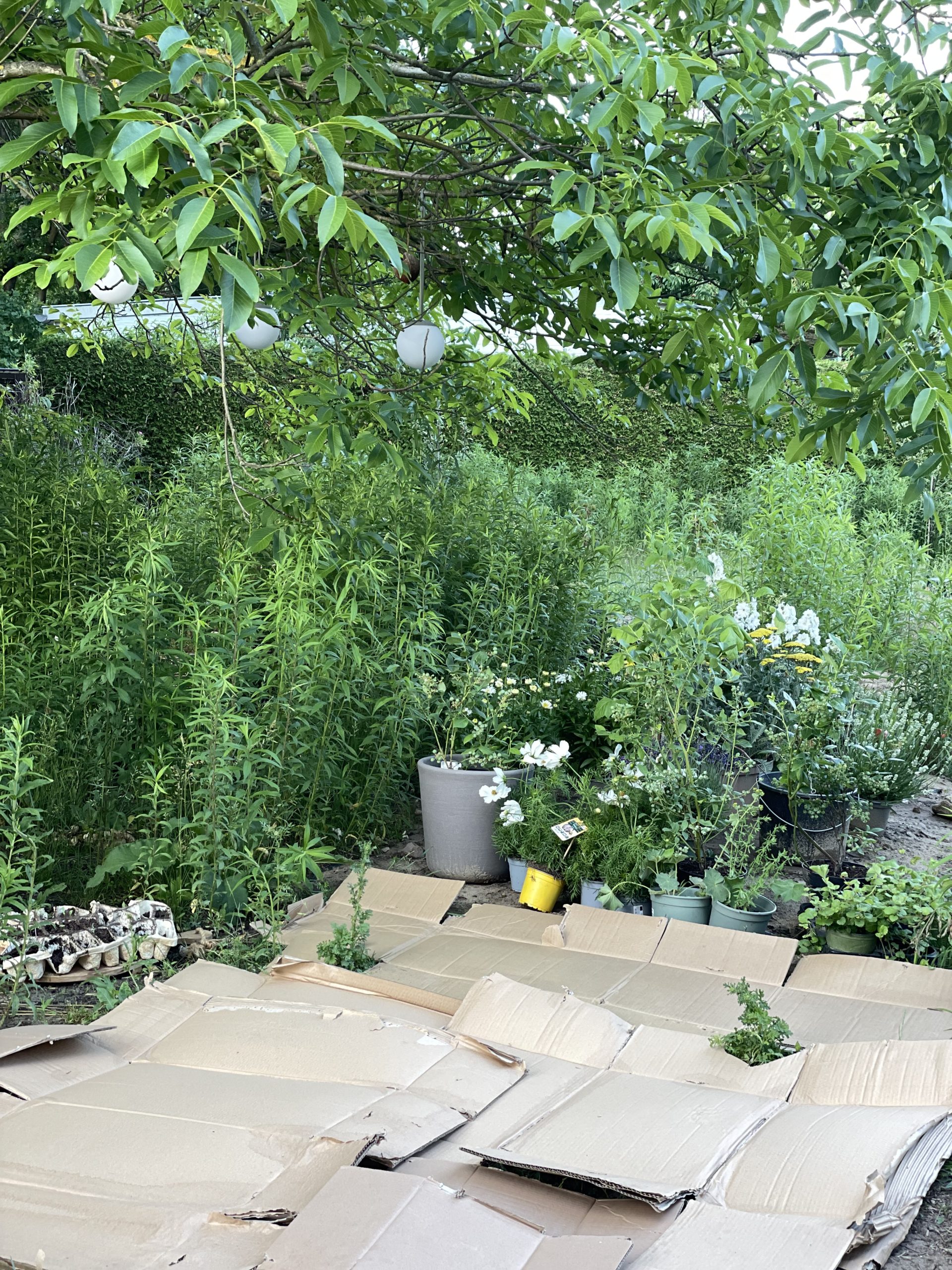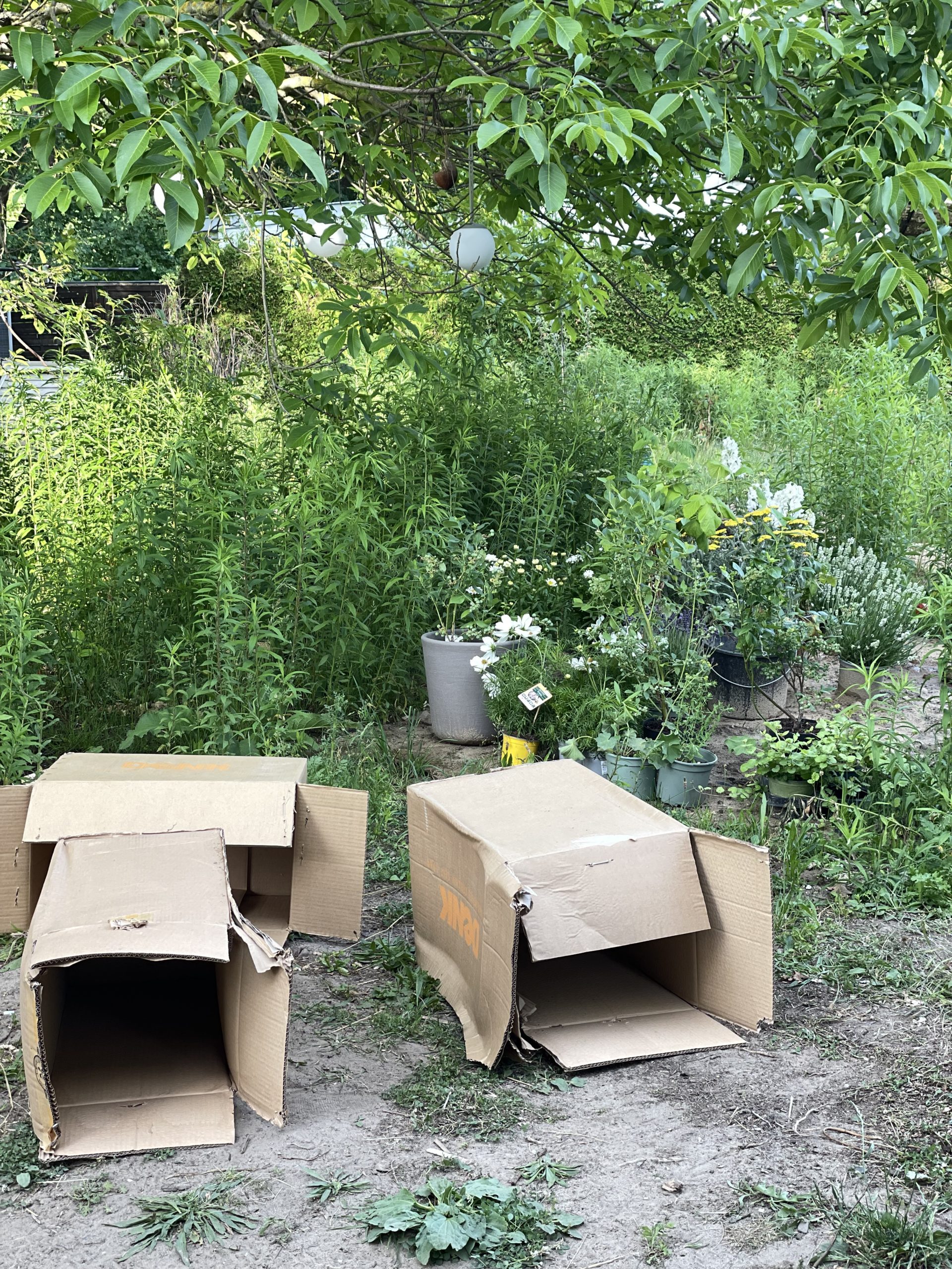 Das Beet wird dann mit einer Schicht Pappe bedeckt. Ich nehme einfach Kartons von Paketen oder Wellpappe. Diese eignet sich tatsächlich am besten, da sie sich leichter verarbeiten lassen und schneller verrotten. Achtet darauf, gute Pappe zu verwenden, also Pappe, die weder beschichtet noch bedruckt ist und auch Aufkleber und Klebeband müssen zuvor entfernt worden sein. Das Plastik verwittert sonst und sorgt für noch mehr Mikroplastik in der Umwelt.Nun die Pappe gut wässern und anschließend mit einer Schicht Kompost bedecken. Jetzt kann nach Lust und Laune bepflanzt werden.