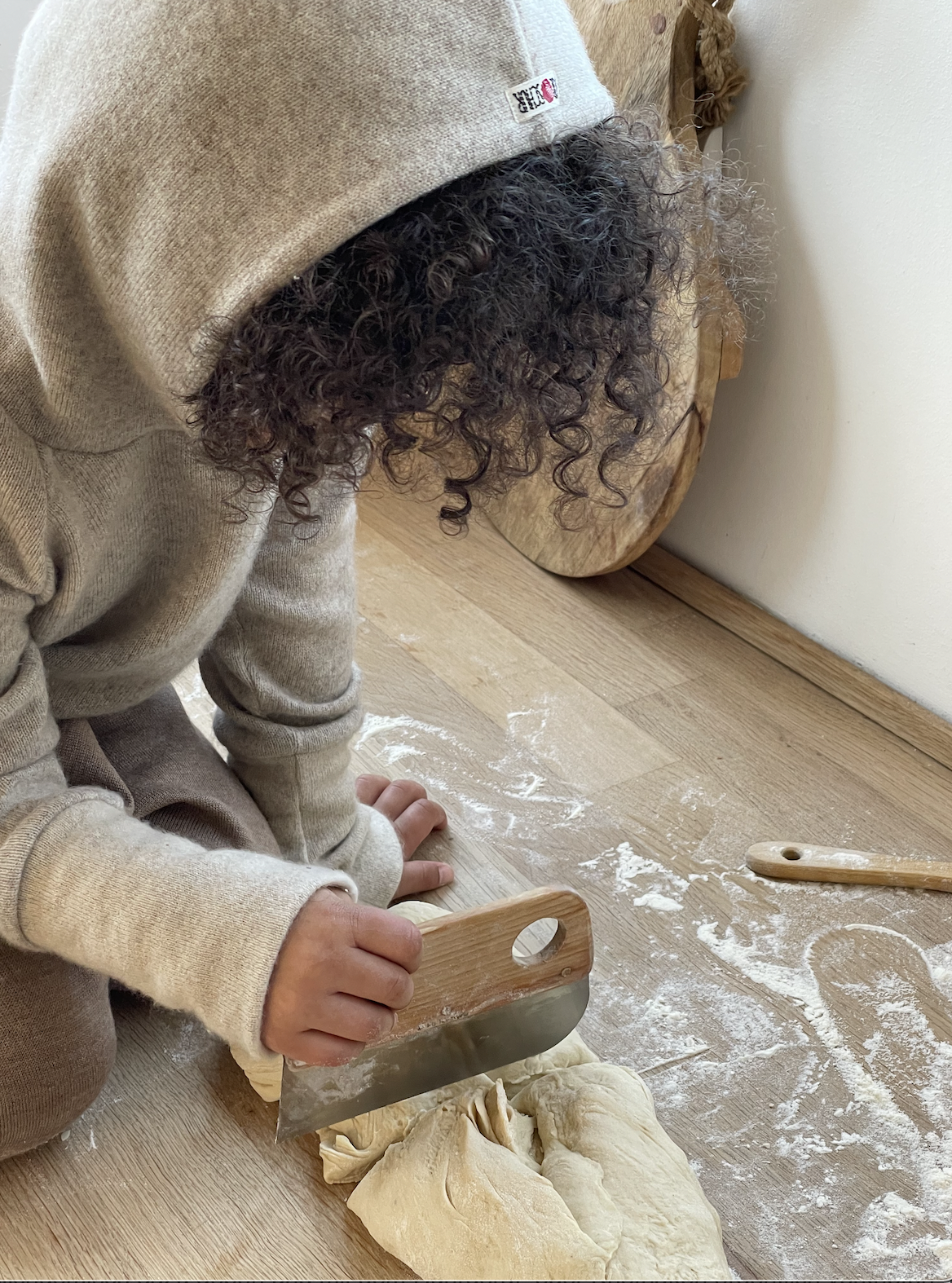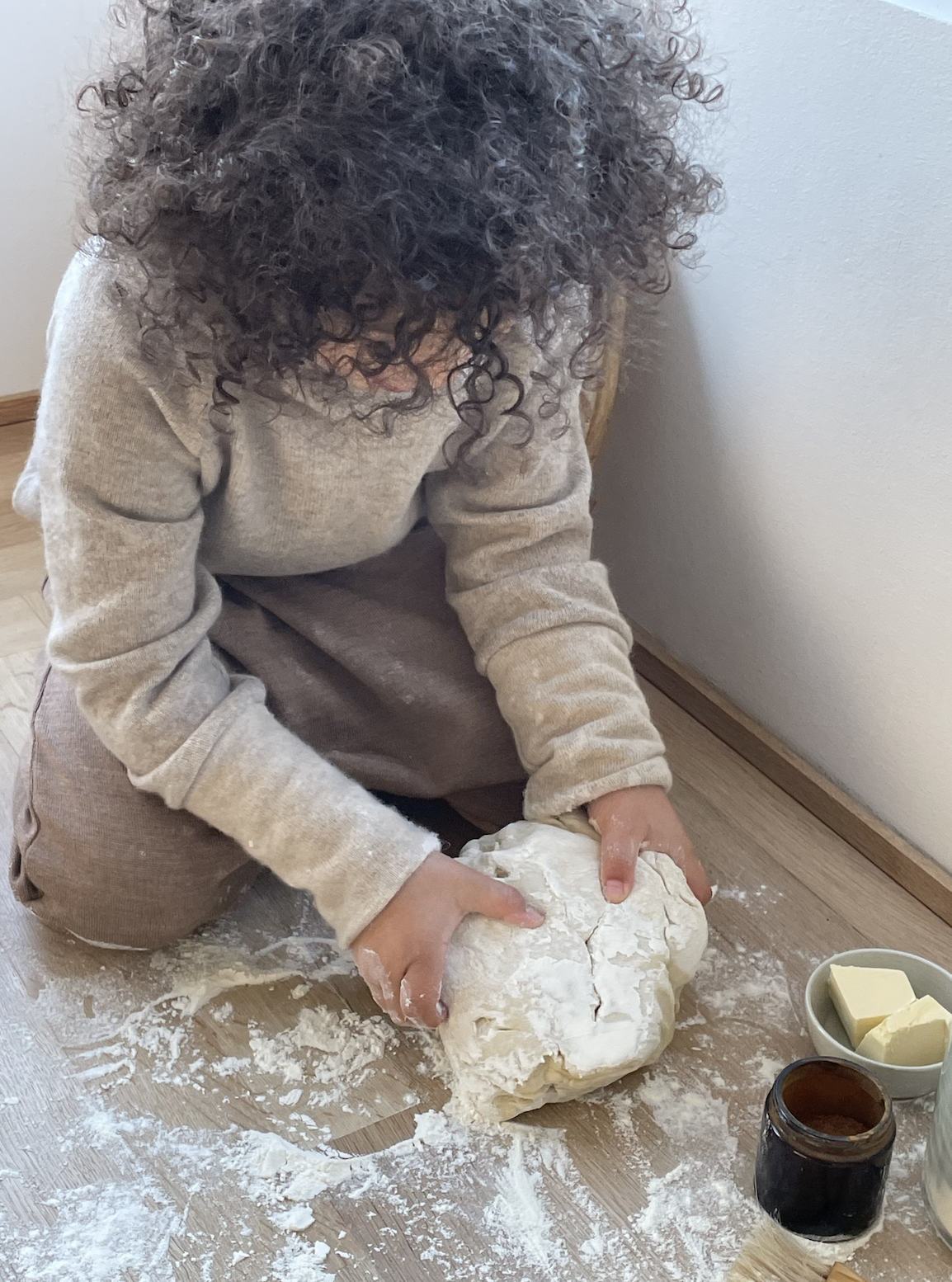 Butter schmelzen, die Milch dazu geben und das Gemisch auf Körpertemperatur (36-37 Grad) erhitzen. Nun die frische Hefe über das Gemisch krümeln und leicht einrühren. Fülle nun das Mehl in eine Rührschüssel, gebe den Zucker, Salz und die Gewürze dazu und mische es zusammen. Nun das Milchgemisch dazu geben und mit dem Rührgerät oder Knethaken ordentlich verkneten. Der Teig muss so lange geknetet werden bis ein geschmeidiger, glatter Teig entsteht. Dann nehmt Ihr ein sauberes Küchentuch, feuchtet es mit frischen Wasser an und legt es über die Rührschüssel. Suche mit deinem Kind einen warmen Ort an dem sich der Teig ein wenig ausruhen und aufgehen kann. Eine Heizung oder auch der Sonnige Platz auf dem Fussboden sind ein guter Ort. Es ist super wichtig geduldig zu sein, denn der Teig braucht mindestens 40 Minuten eher länger, oder aber ihr lasst über Nacht im Kühlschrank gehen. Der Teig muss sich mindestens verdoppelt haben, dann ist er genau richtig.