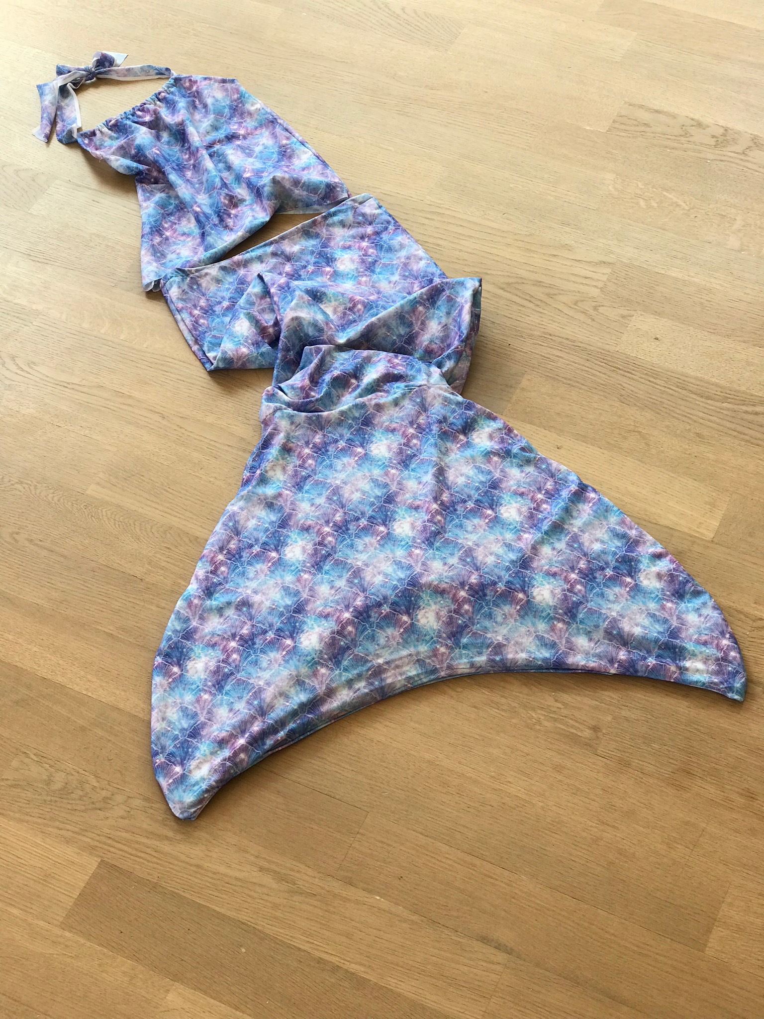 Nachdem ich in einer Instastory vor zwei Wochen die tollen neuen Badestoffe von „Alles für Selbermacher“ gesehen habe, war ich direkt hin und weg. Ich habe den Stoff bestellt und sofort losgelegt und ein neues Meerjungfrauen Outfit genäht! Das Beste in diesem Fall für Euch ist, dass ich beim Nähen der Flosse direkt das Schnittmuster für Euch gemacht habe. Es ist passend für ein 10jähriges Kind, Ihr müsst es lediglich für die anderen Größen ein wenig anpassen. Am besten nehmt Ihr den Knöchelumfang Eures Kindes und die Länge von Hüfte bis Knöchel, damit die Flosse am Ende auch wirklich gut passt. Das Gute an dem Stoff: Er verzeiht einiges und Ihr könnt beliebig anprobieren und immer ein wenig enger nähen, wenn es zu groß ein sollte. Im besten Fall passt die Flosse direkt oder aber Ihr ändert noch ein wenig. Auf jeden Fall ist der Schnitt für das untere Flossenteil genau passend für diese Flosse hier→ die Erwachsene Flosse (klick) Für jüngere Kinder istz die hier prima, die hatten wir vorher (klick)