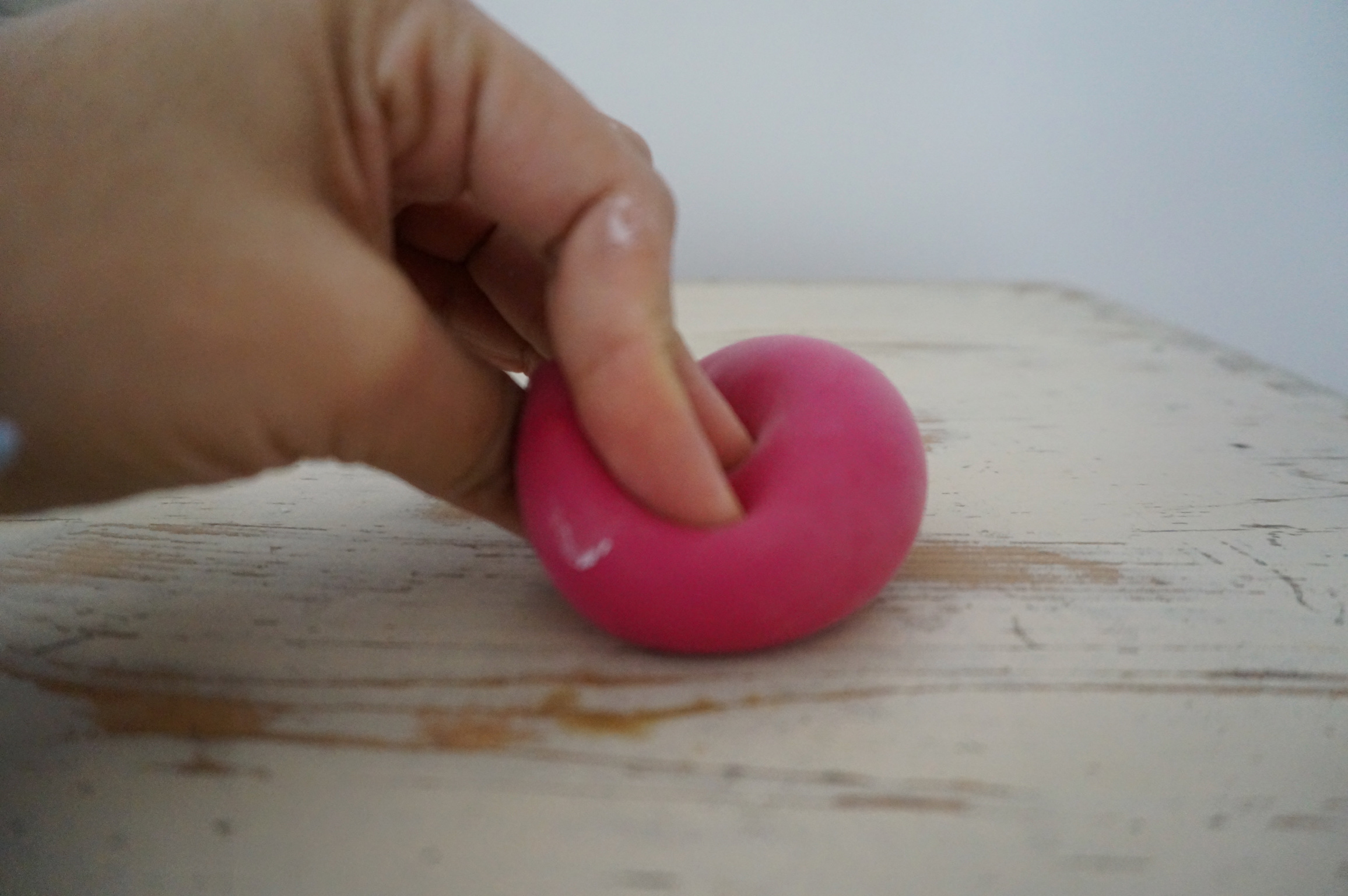Mit dieser Knete kann man etwa 3 Tage wunderbar spielen und dann fängt sie an bröckelig zu werden. Zu dem Zeitpunkt war ich gelinde gesagt ein wenig genervt von all den rosa Knetkügelchen in der ganzen Wohnung. Da mir aber klar war, dass Laéna nicht wirklich erfreut sein wird, wenn ich Knete einfach wegschmeiße und ich es tatsächlich auch wenig nachhaltig gefunden hätte, kam mir die Idee, aus den Knetresten einen Stressball zu machen. Dafür habe ich eine kleine Plastikflasche aufgeschnitten, einen Luftballon drüber gestülpt und die Knete durch die kleine Öffnung reingeprokelt (es ging ganz gut, wenn ihr eine andere Idee habt, dann immer her damit). Wenn die ganze Knete im Luftballon ist, muss nur noch ein Knoten gemacht werden. Fertig! Ich habe zur Sicherheit noch einen zweiten Luftballon drüber gestülpt (sicher ist sicher ;) )