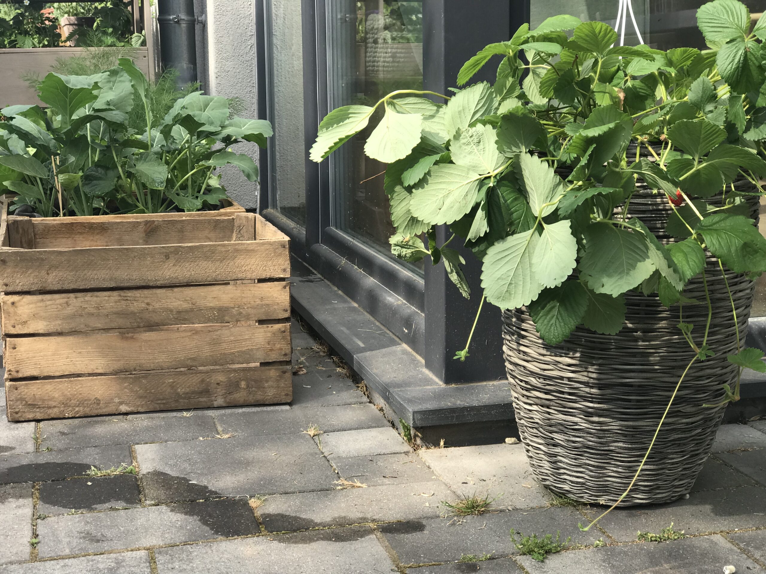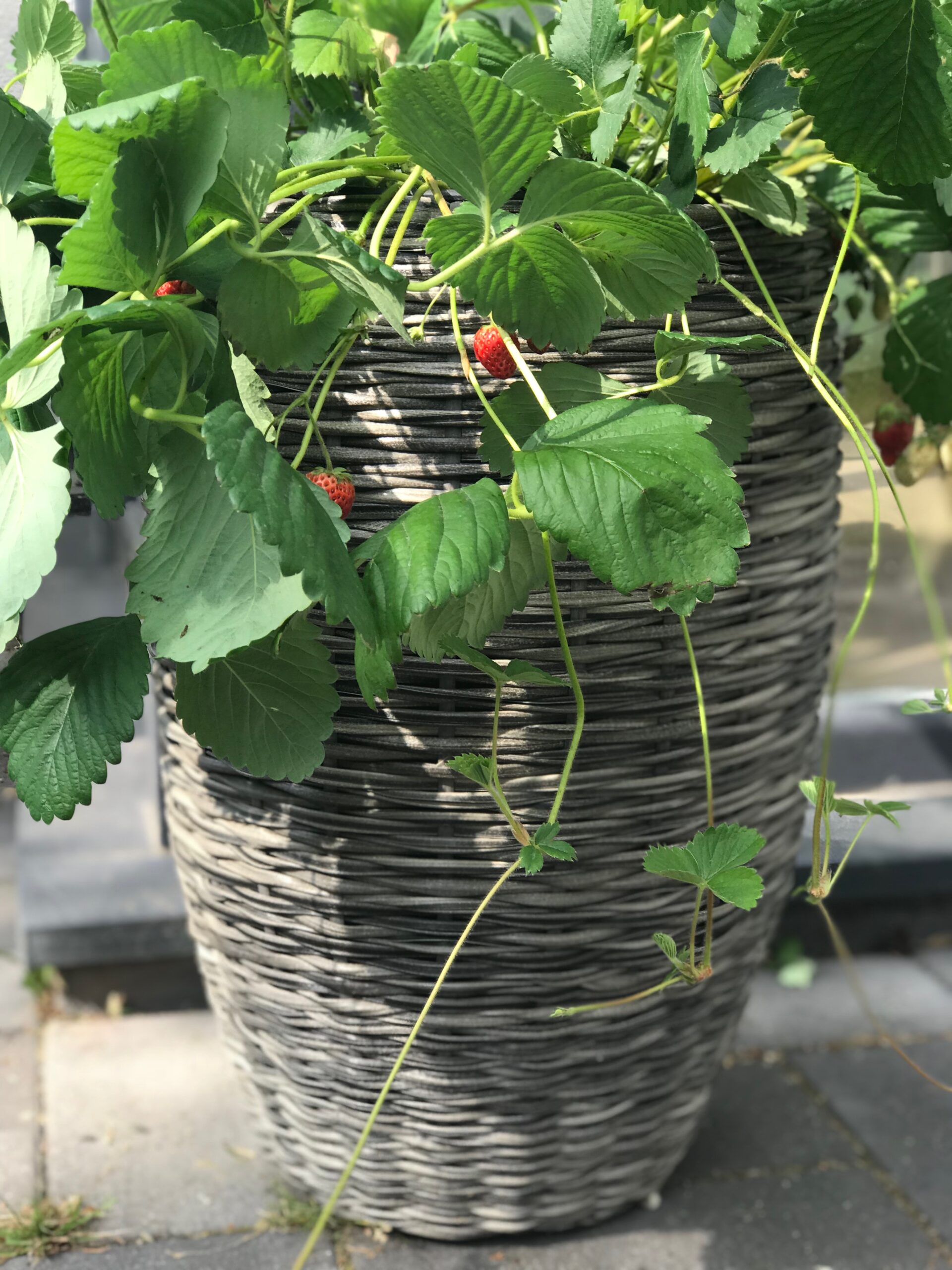 Ich stellte unsere drei Hängeerdbeeren in die großen geflochtenen Übertöpfe, sie haben nun genau die richtige Höhe für kleine, erdbeersüchtige Kinderhände.