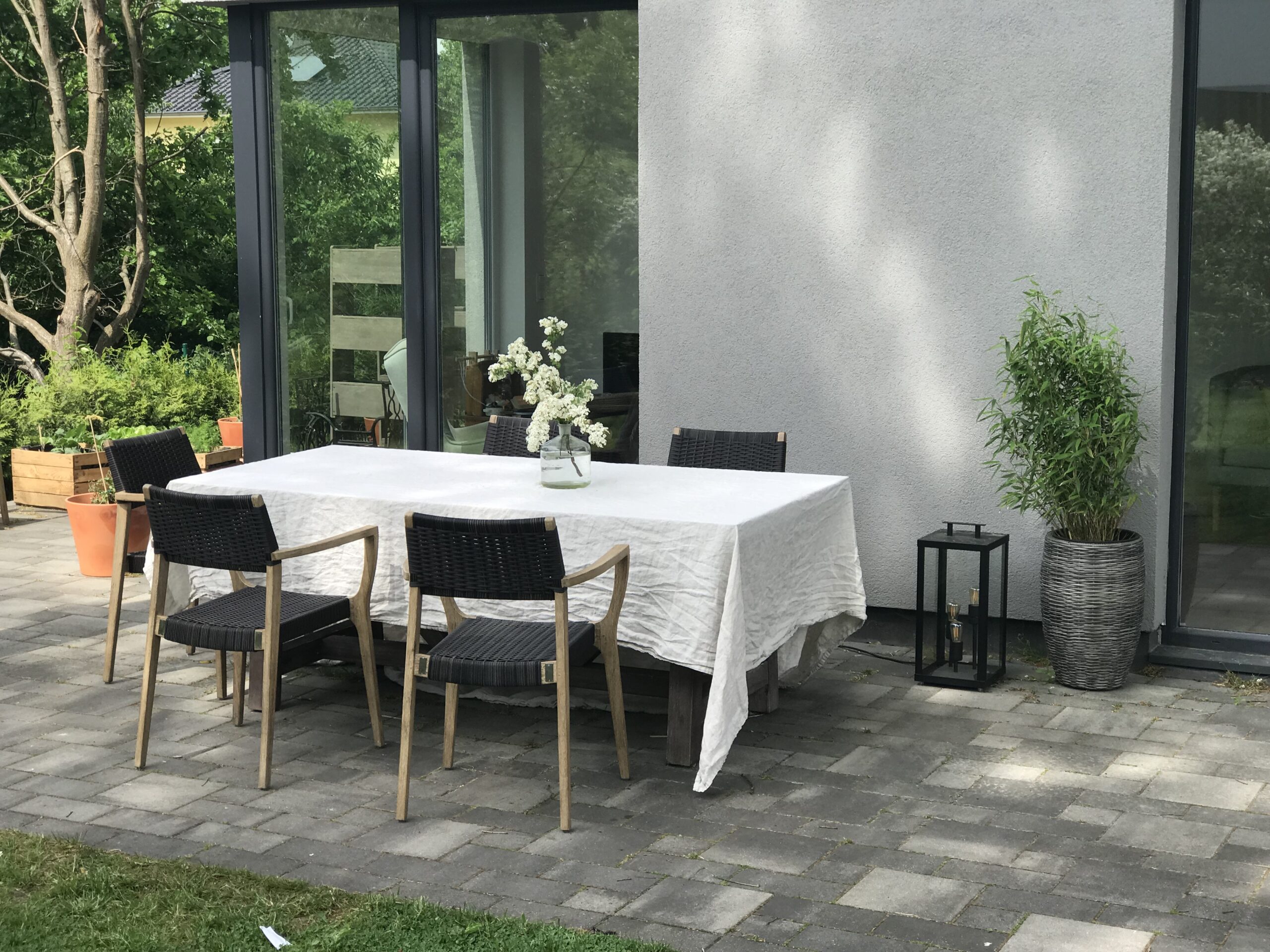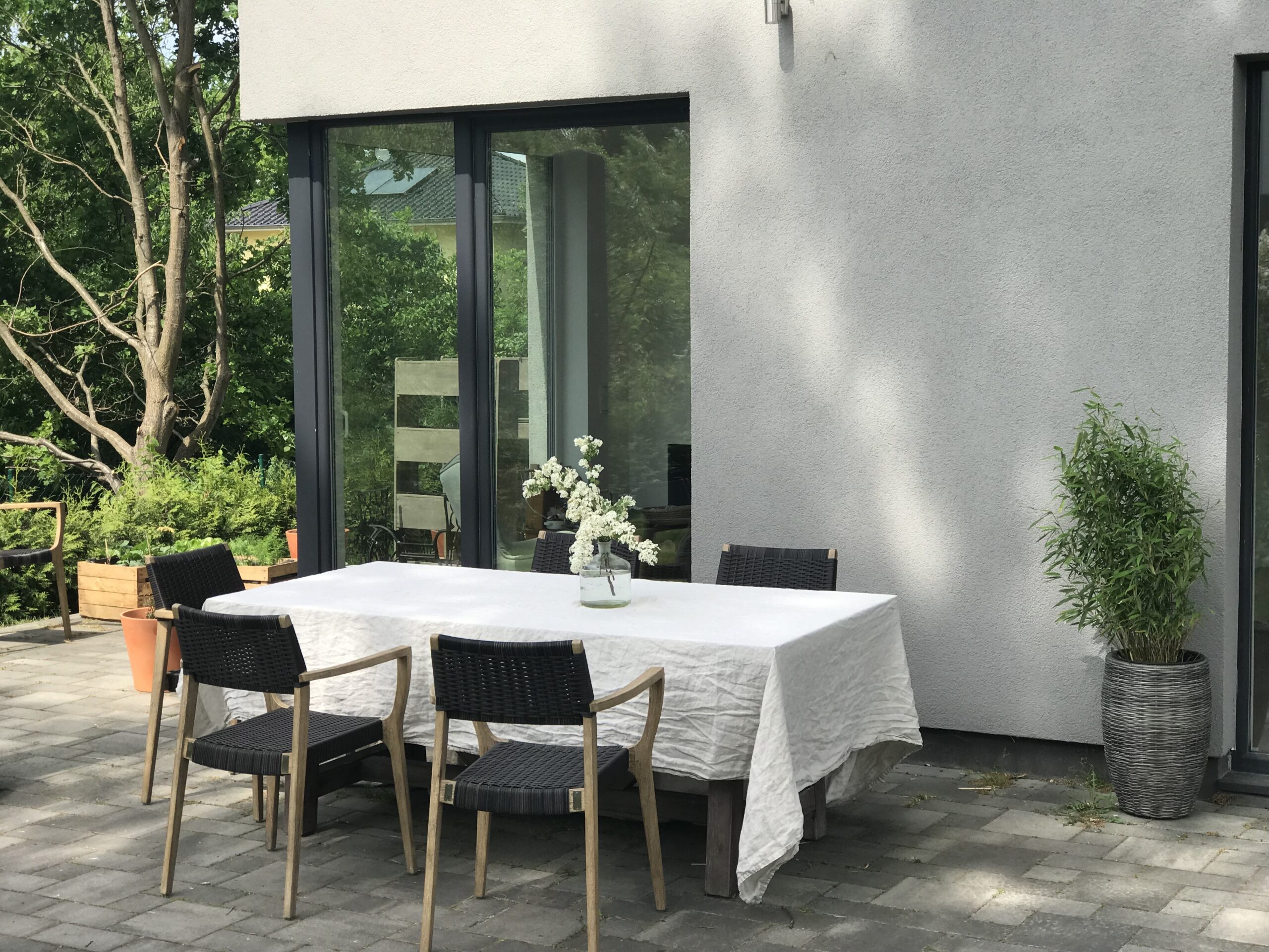 Wir haben unsere schönen Beton Holz Gartenmöbel von Tchibo, die wir schon im letzten Jahr gekauft haben nun noch mit zwei schönen Lampen und zwei Beistelltischen ergänzt, sowie den gerade beschriebenen großen Übertöpfen. Schaut gerne auch noch mal in meinen Gartenartikel aus dem letzen Jahr (klick) dort zeige ich nochmal separat unsere Terrasse, schön ist auch anzusehen wie sie sich nun schon innerhalb eines Jahres geändert hat. Der gelbe Kinderstuhl ist übrigens Vintage aus den 20er Jahren und einfach mit Eddingfarben gelb gesprüht. Wenn ich mal keine Lust auf die Beton Optik habe macht sich eine einfache Leinen Tischdecke auch ganz gut auf dem Gartentisch.
