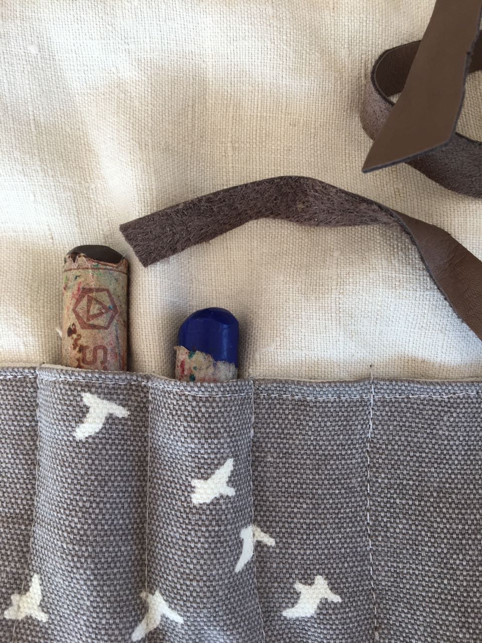 Ich finde es im übrigen sehr schön für innen ein naturfarbenes Leinen zu wählen, denn wenn die Blöckchen hineingeschoben werden nimmt der Stoff nach und nach die Farbe an was sehr schön aussieht und die Stifte finden so automatisch immer wieder an den gleichen Platz.