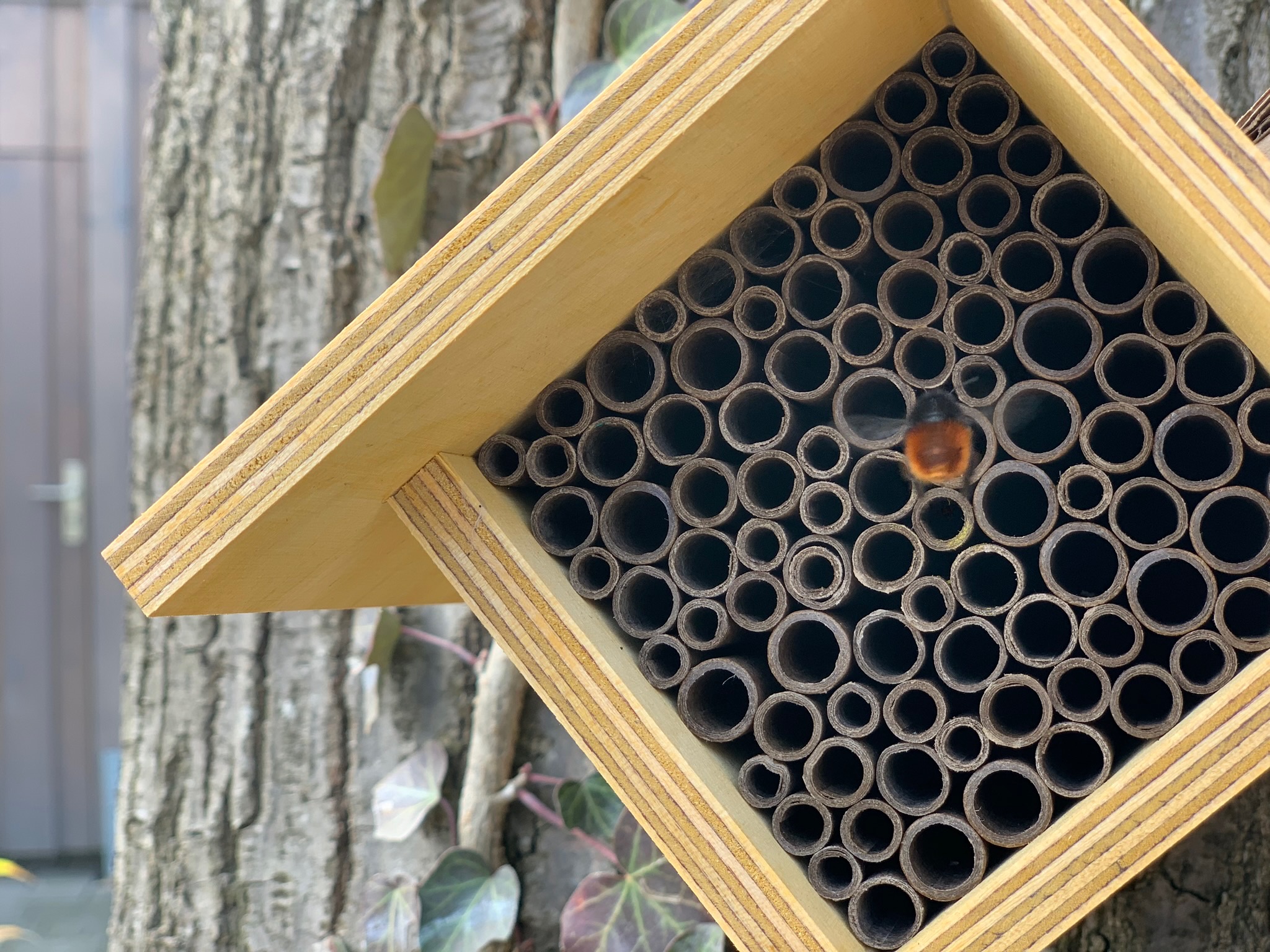 - Die Bienen mögen es schön sonnig, also hängt die Nisthilfe am besten in südlicher Richtung auf.