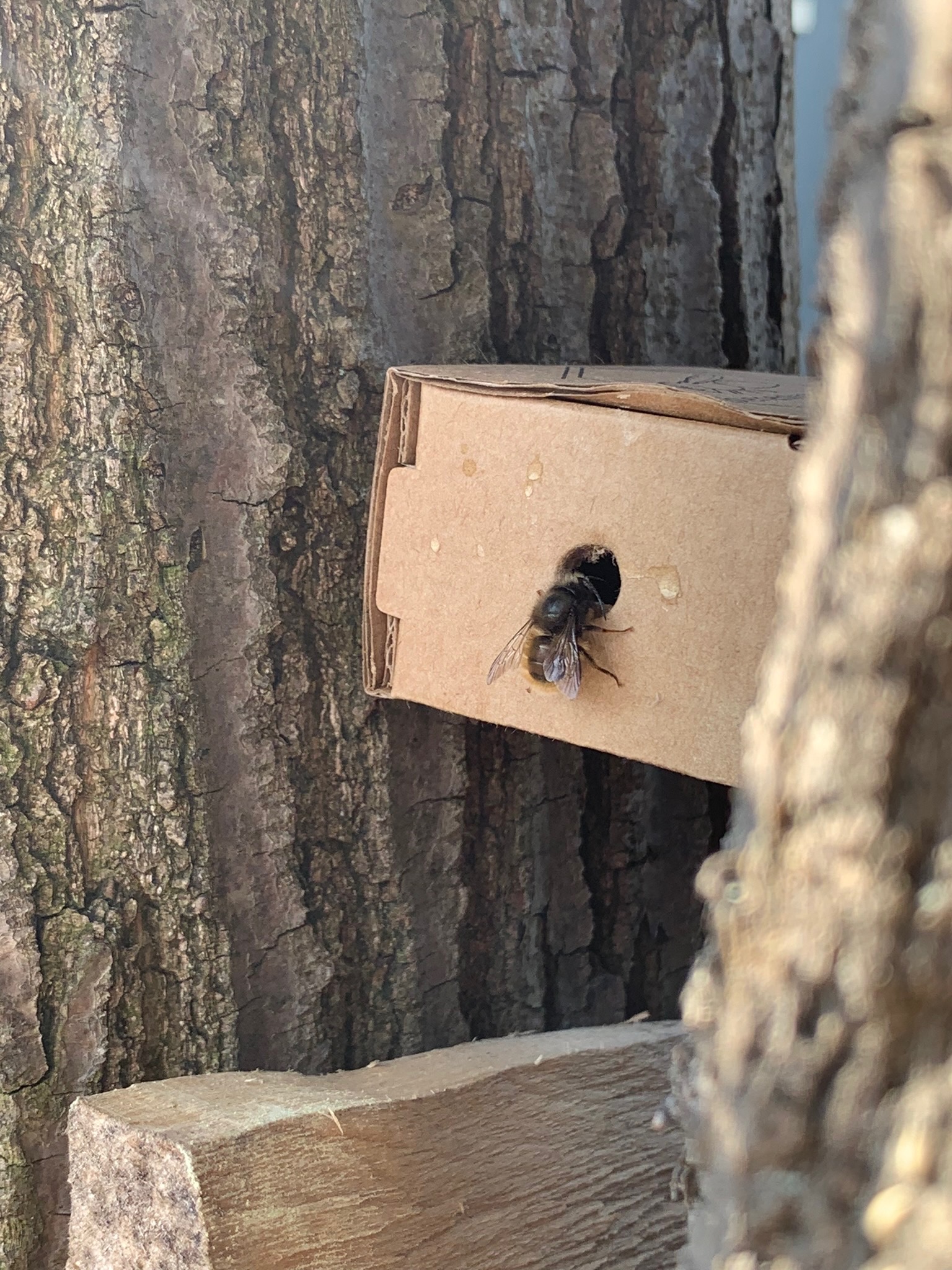Ihr bestellt euch eure Wildbienen im Bienenhotel. Ca 2-4 Wochen später erhaltet ihr eure Wildbienen. Sie kommen tierfreundlich verpackt per Post in einem kleinen Pappkästchen. ( Es ist ein Einmann Betrieb, also seid bitte geduldig, die Bienen haben den ganzen Sommer etwas zu tun ). Nachdem die Bienen bei euch eingetroffen sind, legt ihr sie in den Kühlschrank und bereitet in eurem Garten alles vor. Nun müsst ihr nur darauf warten, dass die Kirschen blühen, denn das ist sozusagen der Startschuss für alle Wild- und Honigbienen, um mit ihrer Arbeit zu beginnen. Ihr könnt die Bienen natürlich auch direkt nach dem Erhalt in die Freiheit entlassen, wenn die Blumen und Blüten schon blühen. In das Kästchen bohrt ihr mit einem Stift ein kleines Loch und befestigt es anschließend an einer Nisthilfe.