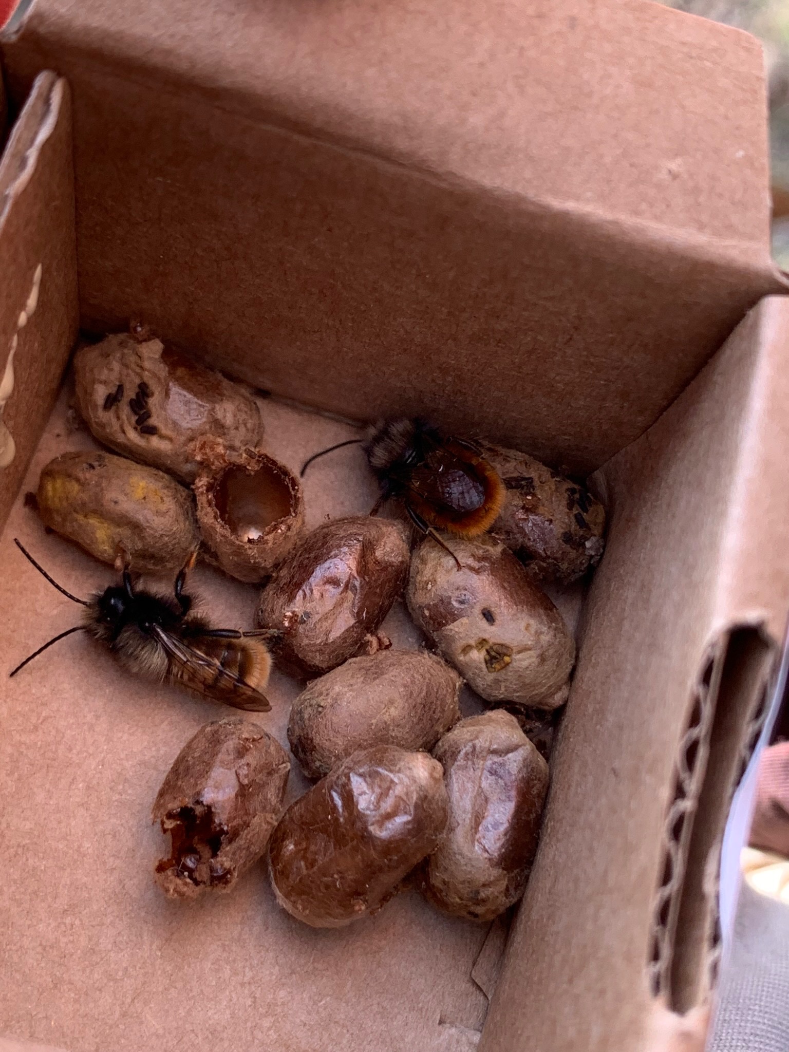 *Die Männchen schlüpfen vor den Weibchen. Sie selbst brauchen die Nisthilfe nicht, da sie ja keine Eier ablegen. Sie sind lediglich für die Begattung zuständig. Da sie die Weibchen in dem Kistchen riechen, schauen sie immer wieder nach, wann diese denn endlich schlüpfen. Wenn die Weibchen schlüpfen, werden sie sofort begattet und machen sich danach an die Arbeit ihre Brutzellen in der Nisthilfe vorzubereiten. Die Weibchen fliegen nicht mehr zurück in das Kokon-Kästchen. Wenn alle geschlüpft sind, kann das Kästchen entfernt werden.