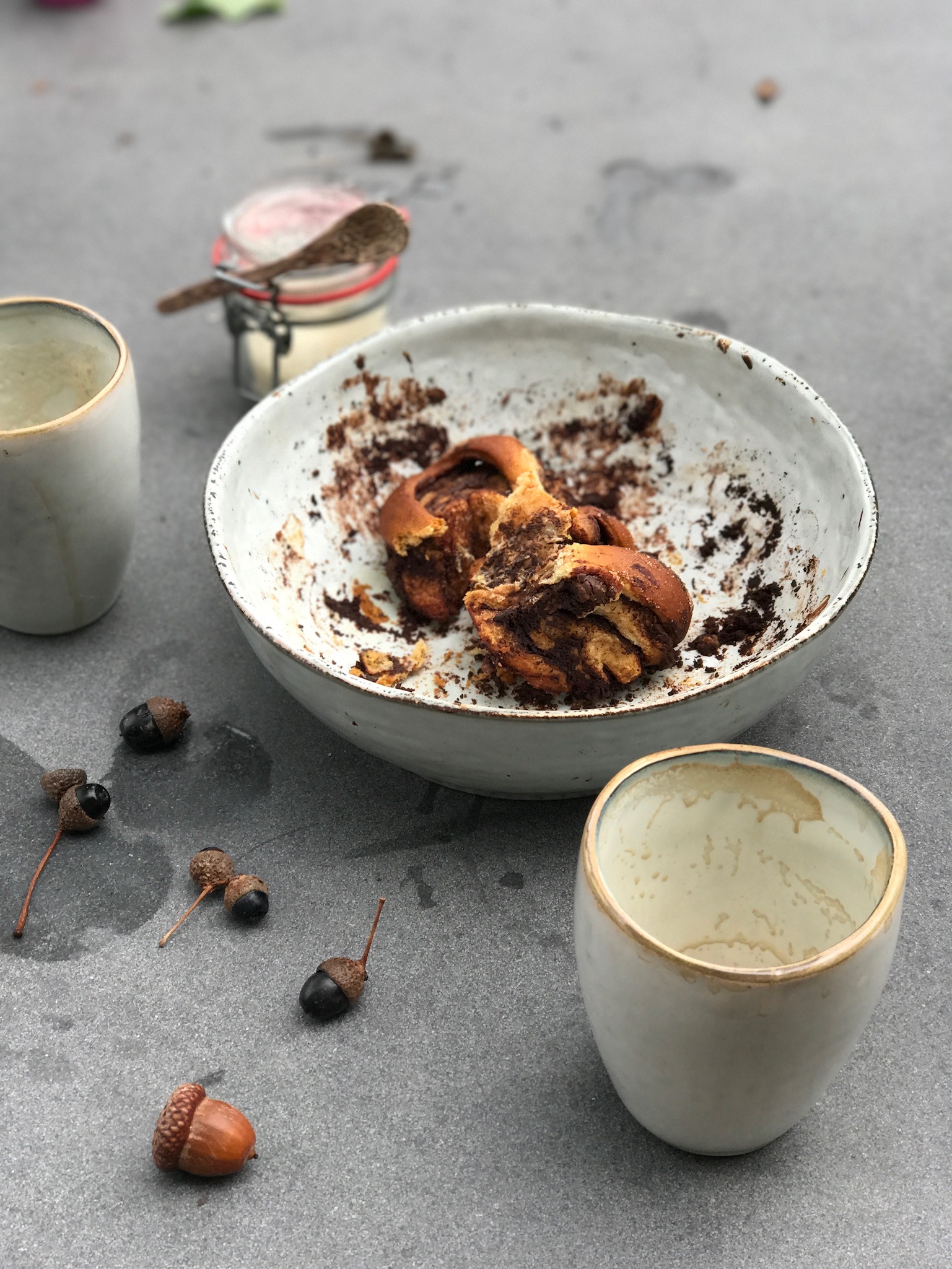 Ihr Lieben, für mehr oder weniger Achtsamkeit in der Erziehung….die Geschichte hinter diesem Kuchen ist folgende,der Hefeteig ist aufgegangen, die Schokolade verteilt ich wollte ihn gerade falten, rollen, schneiden, achte wirklich mal nur eine Sekunde nicht auf Nael und im Bruchteil dieser Unachtsamkeit wird eine ganze Flasche {0,5 Liter} Smoothie auf dem Kuchenteig meinem Telefon und der gesamten Arbeitsplatte ausgekippt.{ nicht auf einmal sondern erst ein wenig und dann mit einem Grinsen im Gesicht die ganze Flasche…. so schnell konnte ich gar nicht reagieren } aber was ich konnte…ordentlich schimpfen ! Ja unglaublich aber war ! Auch ich schimpfe mit meinen Kindern…nicht oft,aber in letzter Zeit immer öfter,denn gerade Nael macht rundum die Uhr nur Quatsch ! Und selbst bei aller Achtsamkeit und Bedürfnis orientiertem aufwachsen und erziehen müssen meine Kinder auch mal Grenzen aufgezeigt bekommen, denn auch wenn ich weiß das Nael austesten und trotzen muss, es wichtig für seine Entwicklung und seinem Platz in der Welt ist und er es auch nicht tut um mich zu ärgern, so denke ich trotzdem das ich zum einen nicht alles akzeptieren muss und sollte und auch nicht immer nur voller Liebe jeden”Mist”den meine Kinder verzapfen kommentieren und begleiten kann! Denn ich bin auch nur ein Mensch und wenn schon zwei Schüsseln zu Bruch gegangen sind, mehrfach Gläser auf dem Tisch willentlich ausgekippt wurden, das große Kind einfach alles um das sie gebeten wird im Schneckentempo oder gar nicht erledigt,ja dann ist auch bei mir irgendwann der Punkt erreicht an dem ich laut werde ! Und das ist auch gut sein, denn es geht nicht das meine Kinder das Gefühl haben sie können sich stetig alles erlauben.Ganz ehrlich, ich möchte mit auch gar nicht ausmalen was aus Ihnen mal wird wenn ich sie komplett aus dem Ruder laufen lassen würde und sie immer alles dürften.Das war nun mein Wort zum Sonntag,wie ihr wahrscheinlich merkt war die letzte Woche ganz schön Kräfte zerrend. Aber ich dachte mir es ist vielleicht ganz gut es mal in die Welt hinaus zu geben denn ein”Nein aus Liebe, und auch die damit einhergehende Frustration die es im Kind auslöst kann auch gut sein.Was denkt ihr?