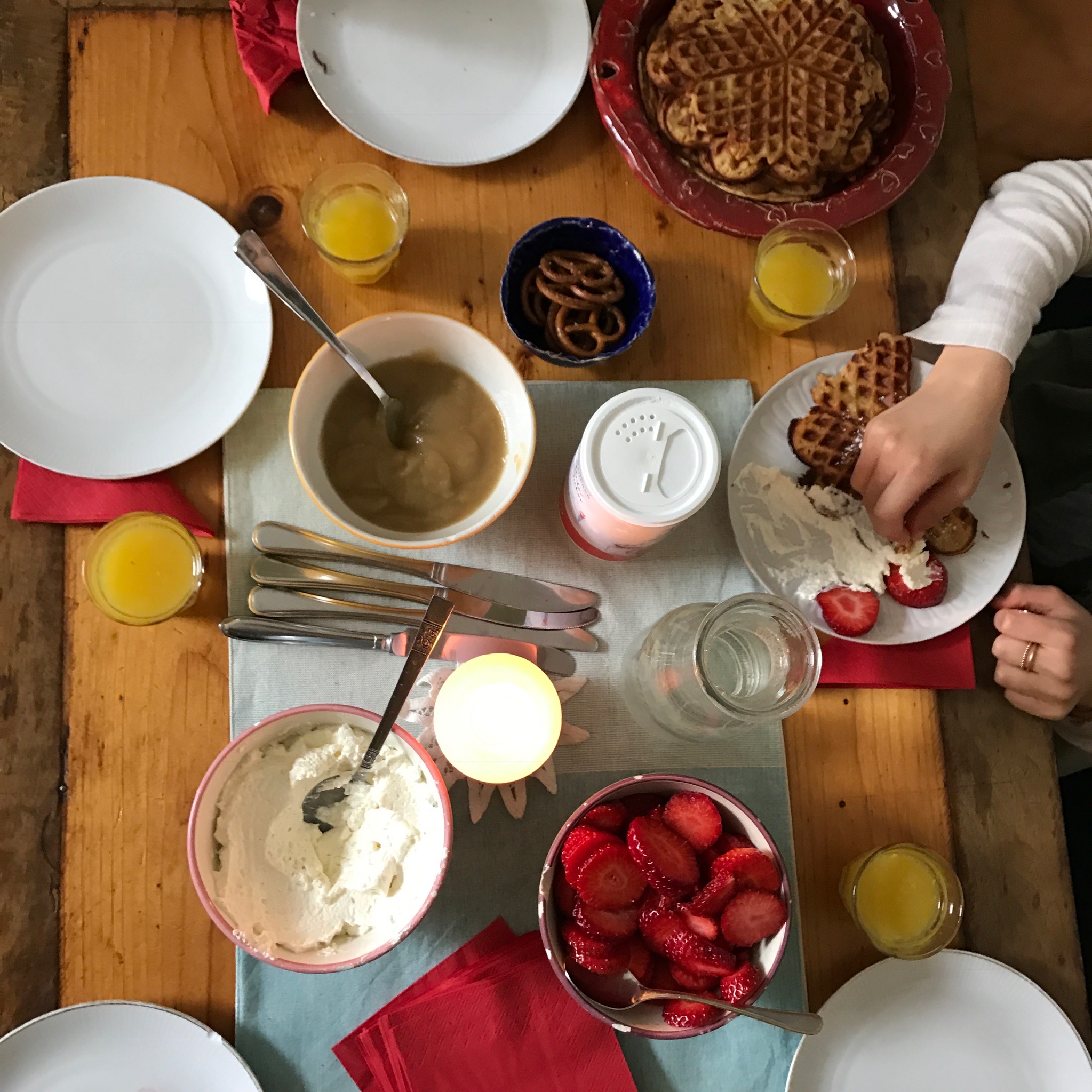 geteilt. Die zwei waren wie Schwestern und so ist die Wiedersehensfreude immer wieder besonders wertvoll und innig, wenn wir es nach langer Zeit endlich wieder schaffen, uns zu treffen. Es gab zum Frühstück zuerst Waffeln mit Sahne und Erdbeeren, Apfelmus und wahnsinnig leckerem Zimt, dazu unseren frisch gepressten Saft und dann ging es irgendwie fröhlich so weiter mit den Leckereien. Den ganzen Tag lang. Am Nachmittag hat der Herr des Hauses eine unglaublich leckere Pizza für uns gebacken – Für die Erwachsenen gab es eine
