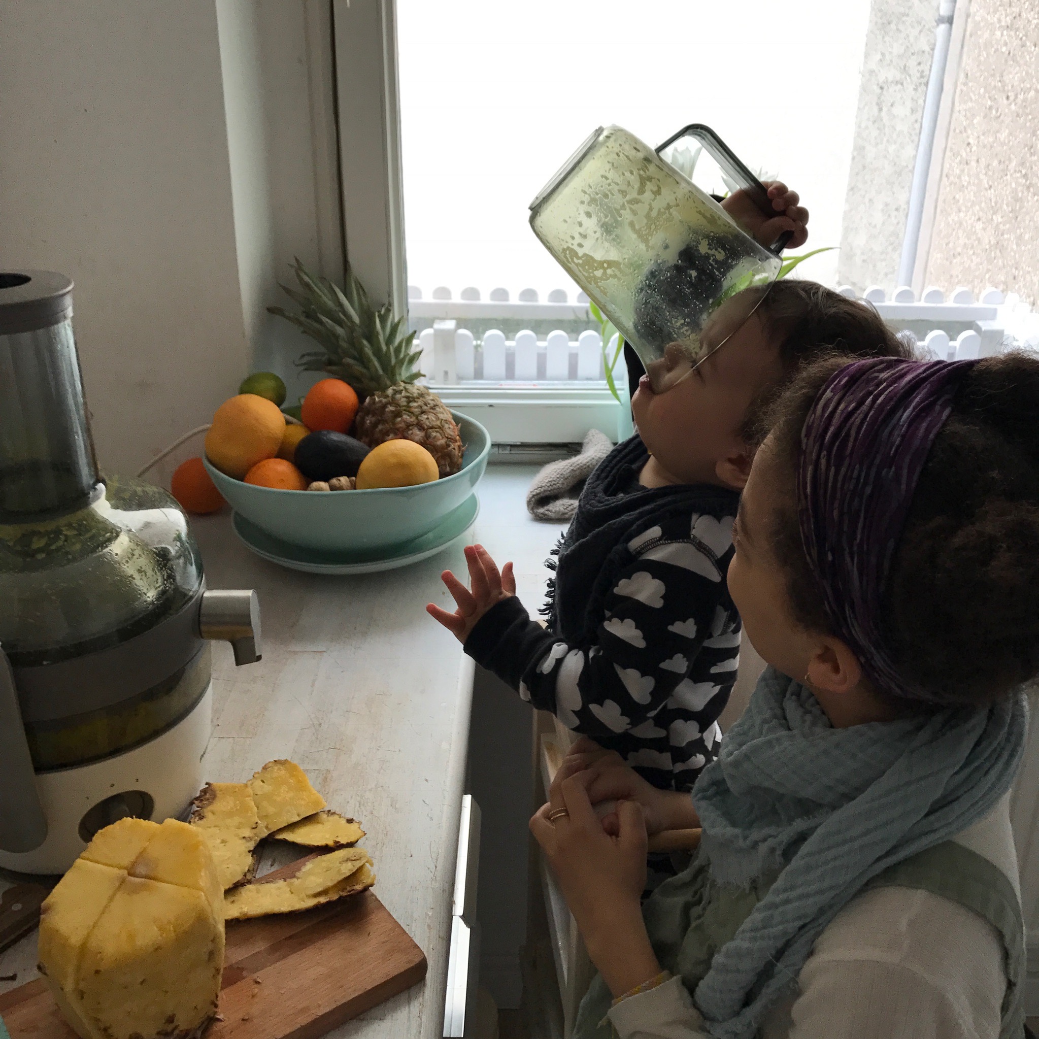Am Sonntag sind wir dann dementsprechend früh aufgewacht, haben einen Apfel-Ananas-Kurkuma-Ingwer-Saft zusammen gemacht. Es war ein Riesenspaß für die Kinder! Wie immer vor allem für Nael. Er liebt es nicht nur den Saft zu pressen, sondern auch ihn dann zu trinken. Am liebsten würde er den Saft komplett alleine direkt hinunter stürzen, aber das haben wir ihm natürlich nicht erlaubt und darauf hin hat er einen kleinen ( großen ) Trotzanfall bekommen – das Geschrei war groß (laut) . Ich bin immer wieder erstaunt, wieviel Willenskraft, Stärke und auch Ausdauer für Heulen und Rumwüten in diesem kleinen Jungen steckt. Ich glaube, da kommt noch einiges auf uns zu… Genauso wie er zu sagen wir 90 % des Tages das liebste, süßeste, sensibelste kleine Zwerglein sein kann, gibt es auch immer mal wieder Zeiten, in denen er komplett ausrastet. Das gute ist, dass wir genau diese Zeiten mit Laéna auch durchgemacht haben,von daher weiß ich glücklicherweise, dass alles o. k. ist und es irgendwann auch wieder vorbeigeht. Ich lass ihn zetern, begegne ihm dabei mit viel Liebe und Geduld. Es ist wichtig, dass die Kinder es einfach mal rauslassen können. Ganz egal ob es der Situation nun entspricht oder aber eben nicht. Manchmal müssen Gefühle einfach mal raus. Für mich ist es wichtig in diesen Momenten mein Kind im Blick zu haben, nicht die Situation, die zum Ausrasten geführt hat, sondern ich versuche einfach achtsam meinem Kind zur Seite zu stehen.