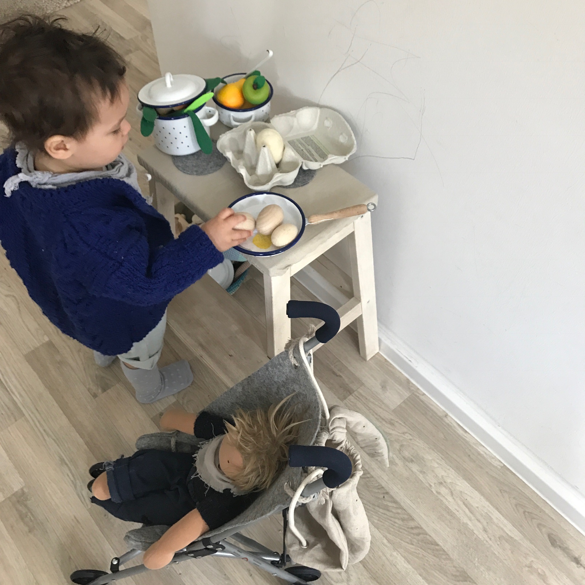 gekuschelt und gestillt. Wir haben Wachsknete gemacht – beziehungsweise gekocht (Das Rezept gibt es morgen) und wir haben Kokos Chips im Dörrautomaten getrocknet und auch da was total leckeres draus gemacht (das Rezept gibt es diese Woche). Außerdem haben wir natürlich ganz viel gespielt, vor allem in seiner neuen kleinen Küche. Viele von euch haben vielleicht mein Küchen DIY gesehen. Das habe ich jetzt noch ein wenig erweitert, indem ich noch mehr Spiegeleier gefilzt und ihm Holzeier aus Laénas Kiste gesucht habe. Jetzt brät er